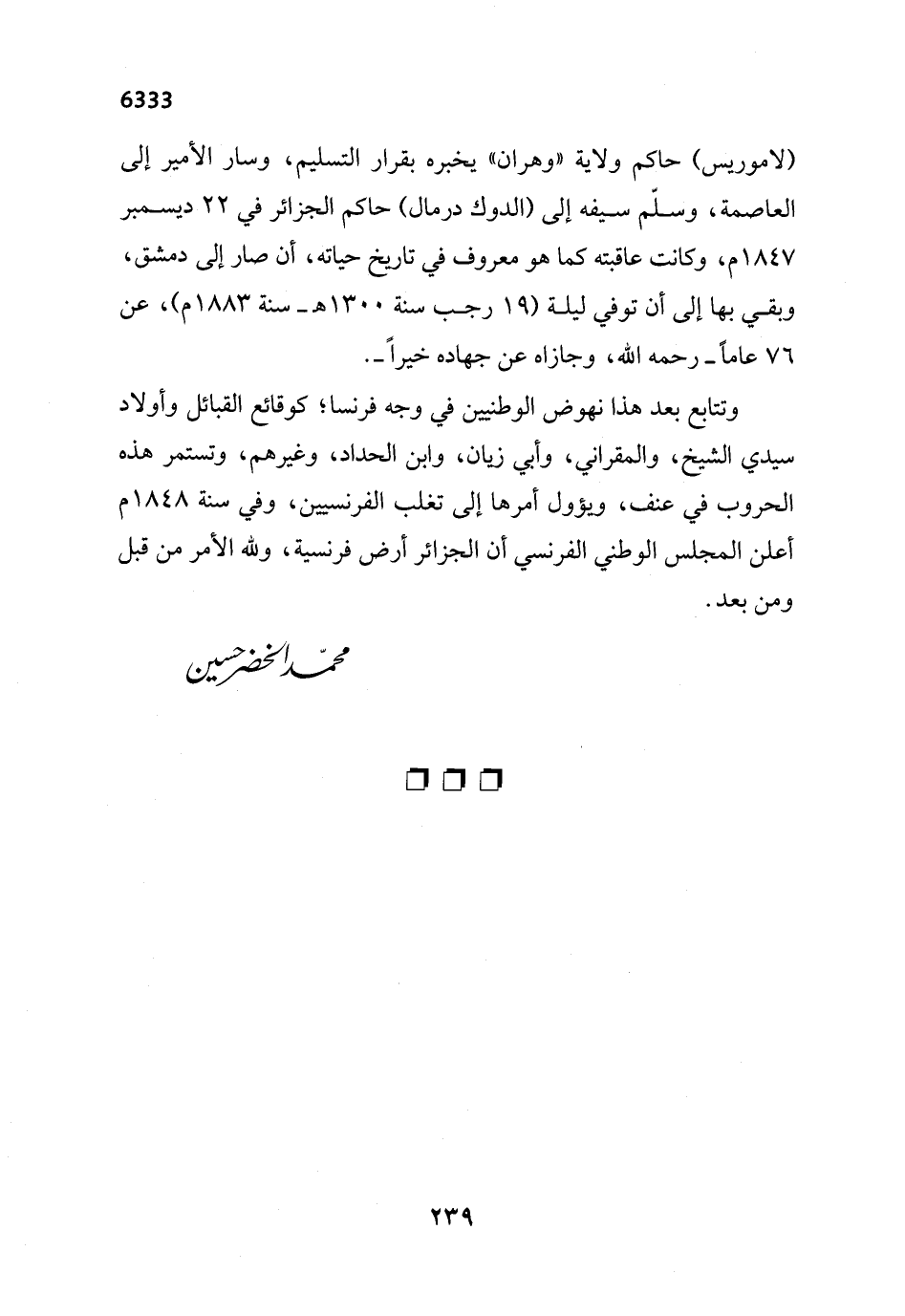 (لاموريس) حاكم ولاية "وهران" يخبره بقرار التسليم، وسار الأمير إلى العاصمة، وسلّم سيفه إلى (الدوك درمال) حاكم الجزائر في 22 ديسمبر 1847 م، وكانت عاقبته كما هو معروف في تاريخ حياته، أن صار إلى دمشق، وبقي بها إلى أن توفي ليلة (19 رجب سنة 1300 هـ - سنة 1883 م)، عن 76 عاماً -رحمه الله-، وجازاه عن جهاده خيراً-.