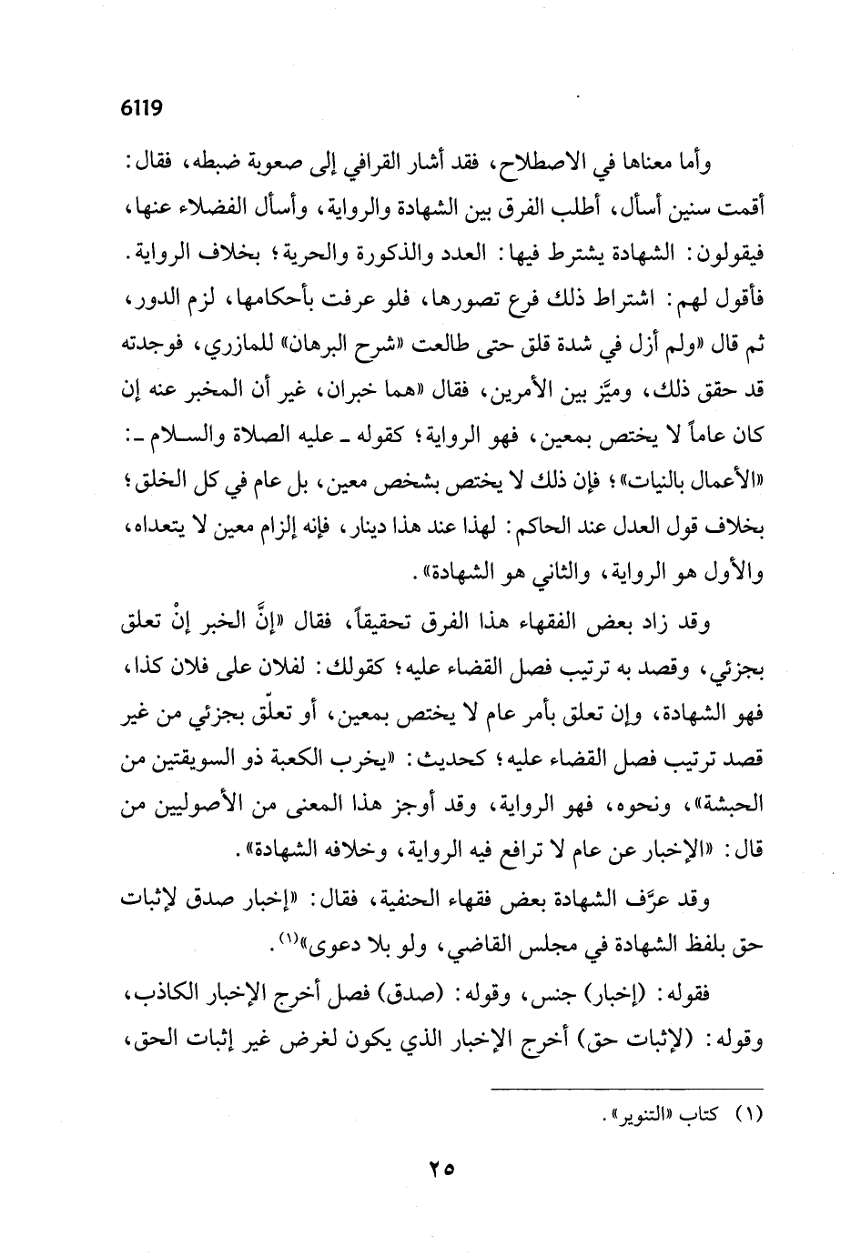 وقد زاد بعض الفقهاء هذا الفرق تحقيقاً، فقال "إنَّ الخبر إنْ تعلق بجزئي، وقصد به ترتيب فصل القضاء عليه؛ كقولك: لفلان على فلان كذا، فهو الشهادة، وإن تعلق بأمر عام لا يختص بمعين، أو تعلّق بجزئي من غير قصد ترتيب فصل القضاء عليه؛ كحديث: "يخرب الكعبة ذو السويقتين من الحبشة"، ونحوه، فهو الرواية، وقد أوجز هذا المعنى من الأصوليين من قال: "الإخبار عن عام لا ترافع فيه الرواية، وخلافه الشهادة".