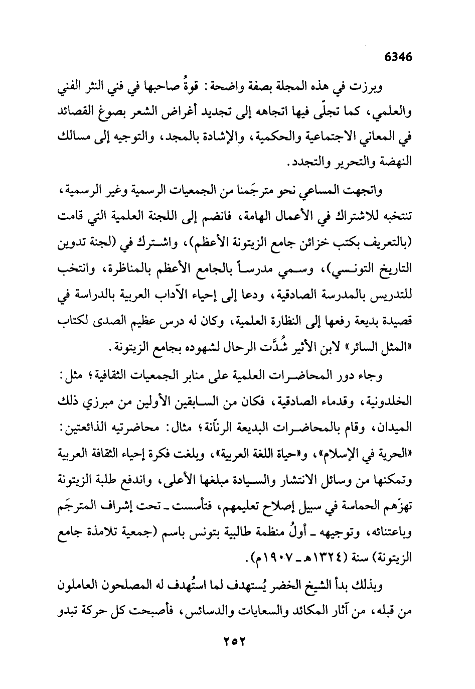 وجاء دور المحاضرات العلمية على منابر الجمعيات الثقافية؛ مثل: الخلدونية، وقدماء الصادقية، فكان من السابقين الأولين من مبرزي ذلك الميدان، وقام بالمحاضرات البديعة الرنّانة؛ مثال: محاضرتيه الذائعتين: "الحرية في الإسلام"، و"حياة اللغة العربية"، وبلغت فكرة إحياء الثقافة العربية وتمكنها من وسائل الانتشار والسيادة مبلغها الأعلى، واندفع طلبة الزيتونة تهزّهم الحماسة في سبيل إصلاح تعليمهم، فتأسست -تحت إشراف المترجَم وباعتنائه، وتوجيهه- أولُ منظمة طالبية بتونس باسم (جمعية تلامذة جامع الزيتونة) سنة (1324 هـ - 1907 م).