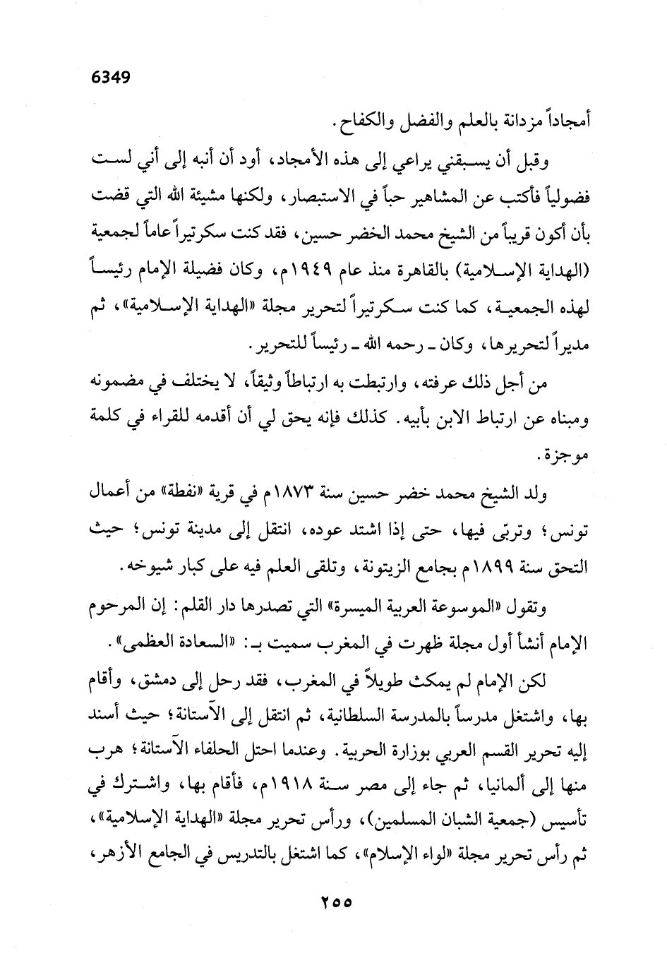 وقبل أن يسبقني يراعي إلى هذه الأمجاد، أود أن أنبه إلى أني لست فضولياً فأكتب عن المشاهير حباً في الاستبصار، ولكنها مشيئة الله التي قضت بأن كون قريباً من الشيخ محمد الخضر حسين، فقد كنت سكرتيراً عاماً لجمعية (الهداية الإسلامية) بالقاهرة منذ عام 1949 م، وكان فضيلة الإمام رئيساً لهذه الجمعية، كما كنت سكرتيراً لتحرير مجلة "الهداية الإسلامية"، ثم مديراً لتحريرها، وكان -رحمه الله- رئيساً للتحرير.