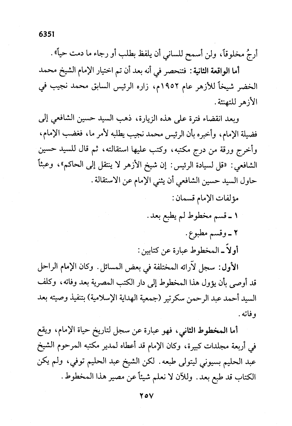 أما المخطوط الثاني، فهو عبارة عن سجل لتاريخ حياة الإمام، ويقع في أربعة مجلدات كبيرة، وكان الإمام قد أعطاه لمدير مكتبه المرحوم الشيخ عبد الحليم بسيوني ليتولى طبعه. لكن الشيخ عبد الحليم توفي، ولم يكن الكتاب قد طبع بعد. وللآن لا نعلم شيئاً عن مصير هذا المخطوط.