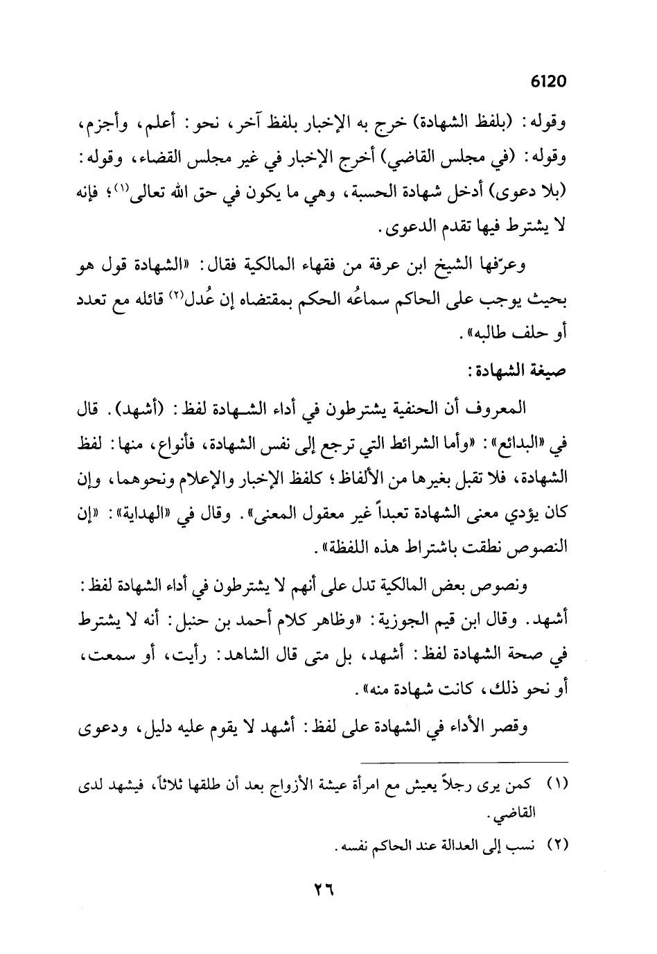 وعرّفها الشيخ ابن عرفة من فقهاء المالكية فقال: "الشهادة قول هو بحيث يوجب على الحاكم سماعُه الحكم بمقتضاه إن عُدل (¬2) قائله مع تعدد أو حلف طالبه".