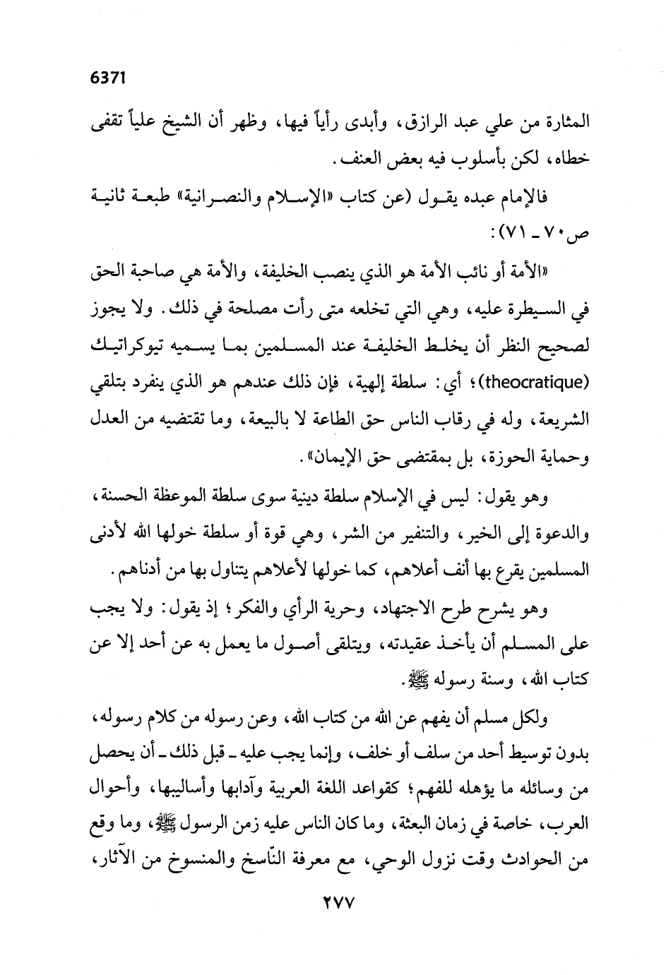 "الأمة أو نائب الأمة هو الذي ينصب الخليفة، والأمة هي صاحبة الحق في السيطرة عليه، وهي التي تخلعه متى رأت مصلحة في ذلك. ولا يجوز لصحيح النظر أن يخلط الخليفة عند المسلمين بما يسميه تيوكراتيك (theocratique)؛ أي: سلطة إلهية، فإن ذلك عندهم هو الذي ينفرد بتلقي الشريعة، وله في رقاب الناس حق الطاعة لا بالبيعة، وما تقتضيه من العدل وحماية الحوزة، بل بمقتضى حق الإيمان".