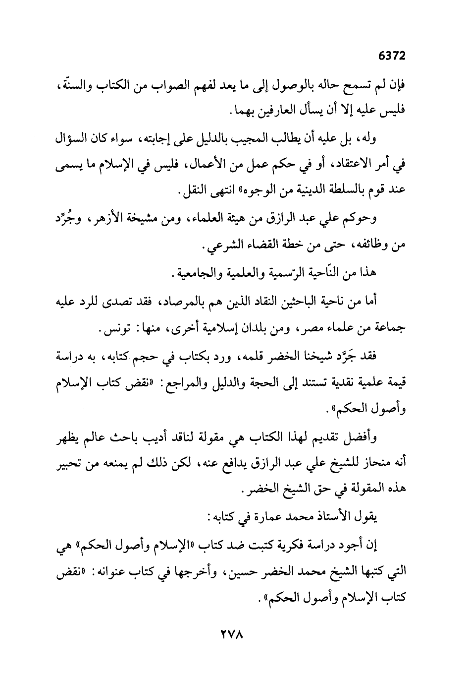 إن أجود دراسة فكرية كتبت ضد كتاب "الإسلام وأصول الحكم" هي التي كتبها الشيخ محمد الخضر حسين، وأخرجها في كتاب عنوانه: "نقض كتاب الإسلام وأصول الحكم".