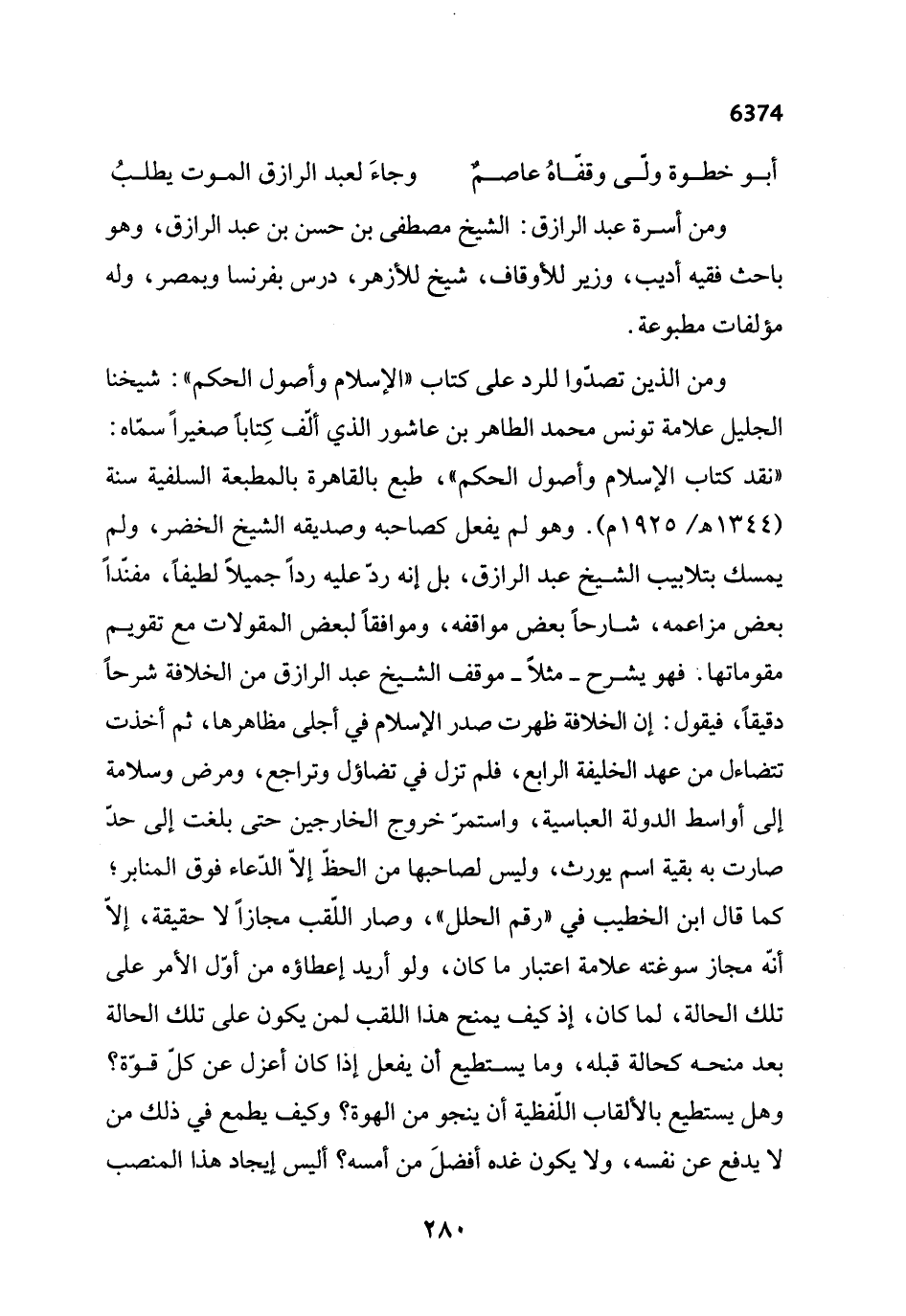 ومن الذين تصدّوا للرد على كتاب "الإسلام وأصول الحكم": شيخنا الجليل علامة تونس محمد الطاهر بن عاشور الذي ألّف كِتاباً صغيراً سمّاه: "نقد كتاب الإسلام وأصول الحكم"، طبع بالقاهرة بالمطبعة السلفية سنة (1344 هـ / 1925 م). وهو لم يفعل كصاحبه وصديقه الشيخ الخضر، ولم يمسك بتلابيب الشيخ عبد الرازق، بل إنه ردّ عليه رداً جميلاً لطيفاً، مفنّداً بعض مزاعمه، شارحاً بعض مواقفه، وموافقاً لبعض المقولات مع تقويم مقوماتها. فهو يشرح -مثلاً- موقف الشيخ عبد الرازق من الخلافة شرحاً دقيقاً، فيقول: إن الخلافة ظهرت صدر الإسلام في أجلى مظاهرها، ثم أخذت تتضاءل من عهد الخليفة الرابع، فلم تزل في تضاؤل وتراجع، ومرض وسلامة إلى أواسط الدولة العباسية، واستمرّ خروج الخارجين حتى بلغت إلى حد صارت به بقية اسم يورث، وليس لصاحبها من الحط إلّا الدّعاء فوق المنابر؛ كما قال ابن الخطيب في "رقم الحلل"، وصار اللّقب مجازاً لا حقيقة، إلّا أنّه مجاز سوغته علامة اعتبار ما كان، ولو أريد إعطاؤه من أوّل الأمر على تلك الحالة، لما كان، إذ كيف يمنح هذا اللقب لمن يكون على تلك الحالة بعد منحه كحالة قبله، وما يستطيع أن يفعل إذا كان أعزل عن كلّ قوّة؟ وهل يستطيع بالألقاب اللّفظية أن ينجو من الهوة؟ وكيف يطمع في ذلك من لا يدفع عن نفسه، ولا يكون غده أفضلَ من أمسه؟ أليس إيجاد هذا المنصب