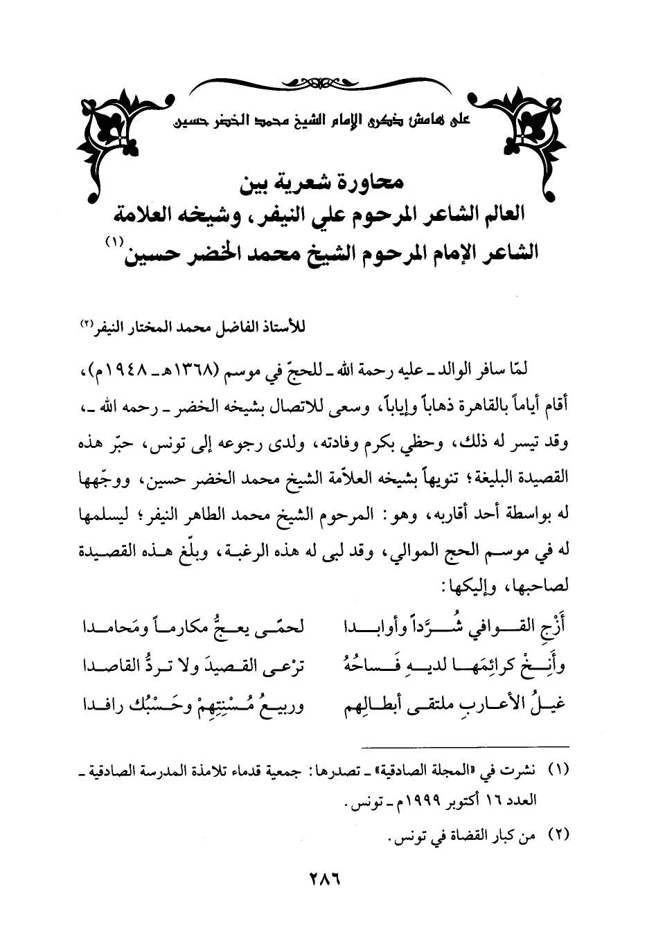 محاورة شعرية بين العالم الشاعر المرحوم علي النيفر، وشيخه العلامة الشاعر الإمام المرحوم الشعغ محمد الخضر حسين (¬1)