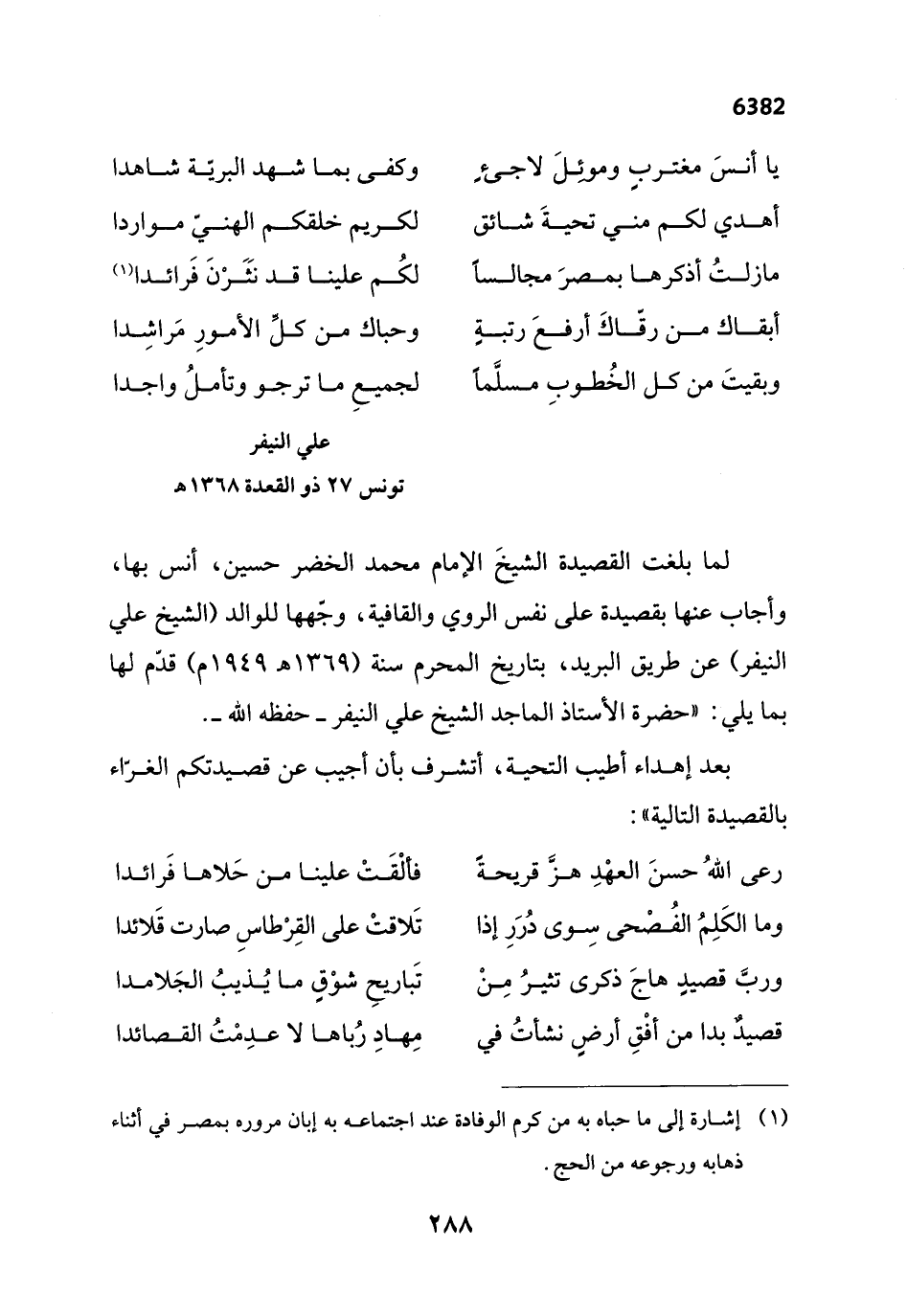 لما بلغت القصيدة الشيخَ الإمام محمد الخضر حسين، أنس بها، وأجاب عنها بقصيدة على نفس الروي والقافية، وجّهها للوالد (الشيخ علي النيفر) عن طريق البريد، بتاريخ المحرم سنة (1369 هـ - 1949 م) قدّم لها بما يلي: "حضرة الأستاذ الماجد الشيخ علي النيفر -حفظه الله-.
