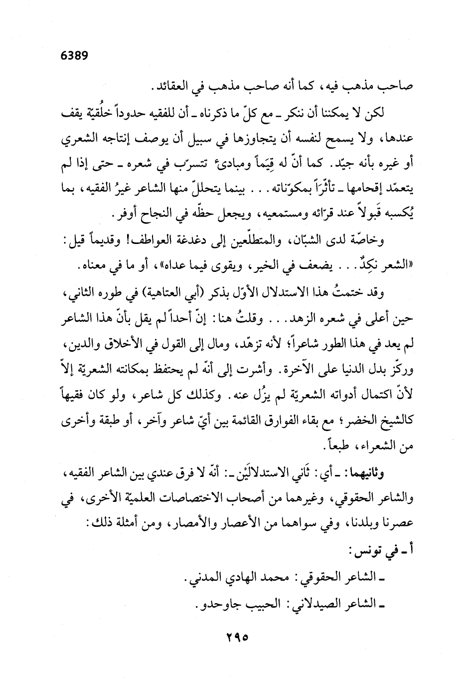 وقد ختمتُ هذا الاستدلال الأول بذكر (أبي العتاهية) في طوره الثاني، حين أعلى في شعره الزهد ... وقلتُ هنا: إنّ أحداً لم يقل بأنّ هذا الشاعر لم يعد في هذا الطور شاعراً؛ لأنه تزهّد، ومال إلى القول في الأخلاق والدين، وركّز بدل الدنيا على الآخرة. وأشرت إلى أنّه لم يحتفظ بمكانته الشعريّة إلّا لأنّ اكتمال أدواته الشعريّة لم يزُل عنه. وكذلك كل شاعر، ولو كان فقيهاً كالشيخ الخضر؛ مع بقاء الفوارق القائمة بين أيّ شاعر وآخر، أو طبقة وأخرى من الشعراء، طبعاً.