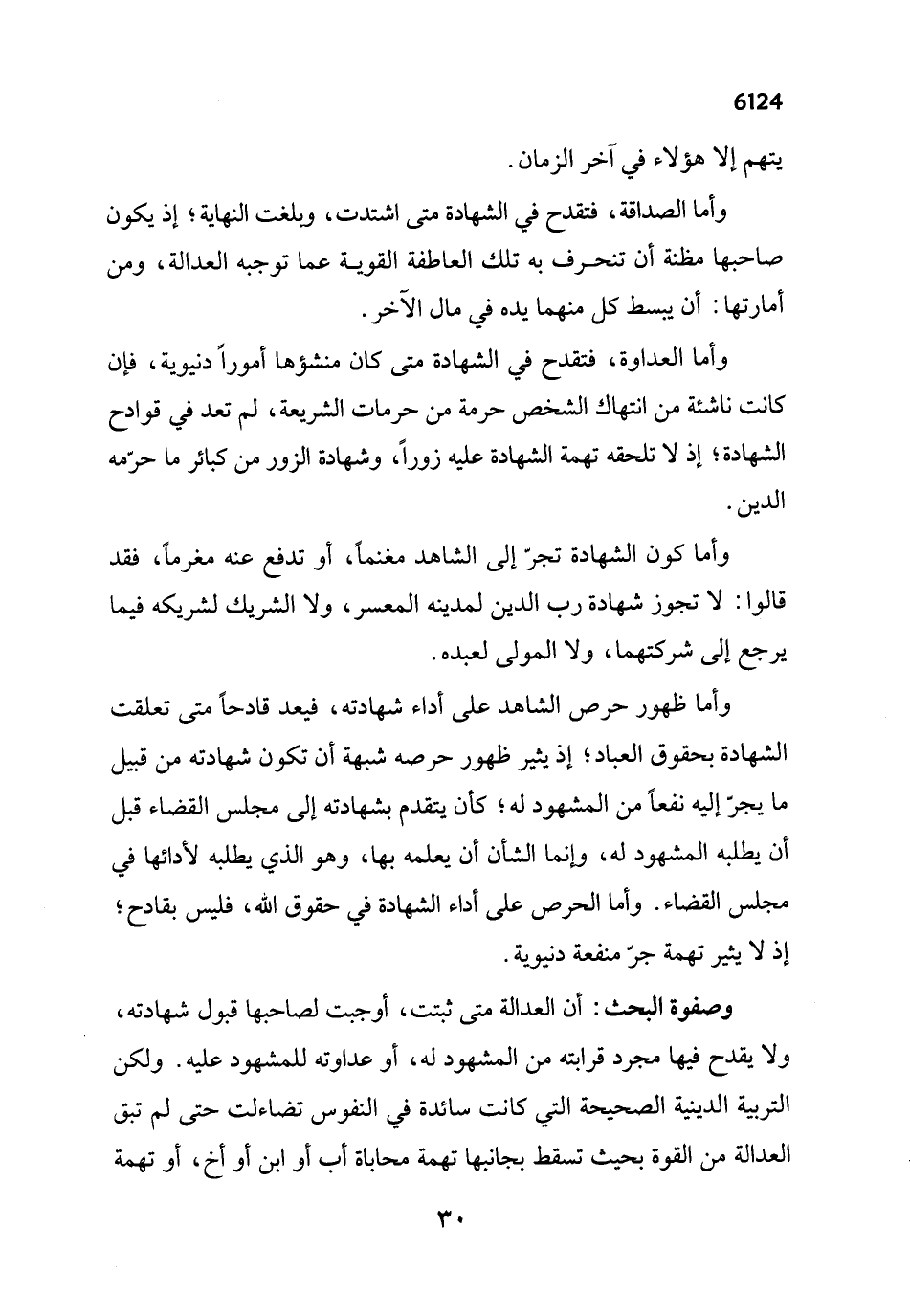 وصفوة البحث: أن العدالة متى ثبتت، أوجبت لصاحبها قبول شهادته، ولا يقدح فيها مجرد قرابته من المشهود له، أو عداوته للمشهود عليه. ولكن التربية الدينية الصحيحة التي كانت سائدة في النفوس تضاءلت حتى لم تبق العدالة من القوة بحيث تسقط بجانبها تهمة محاباة أب أو ابن أو أخ، أو تهمة