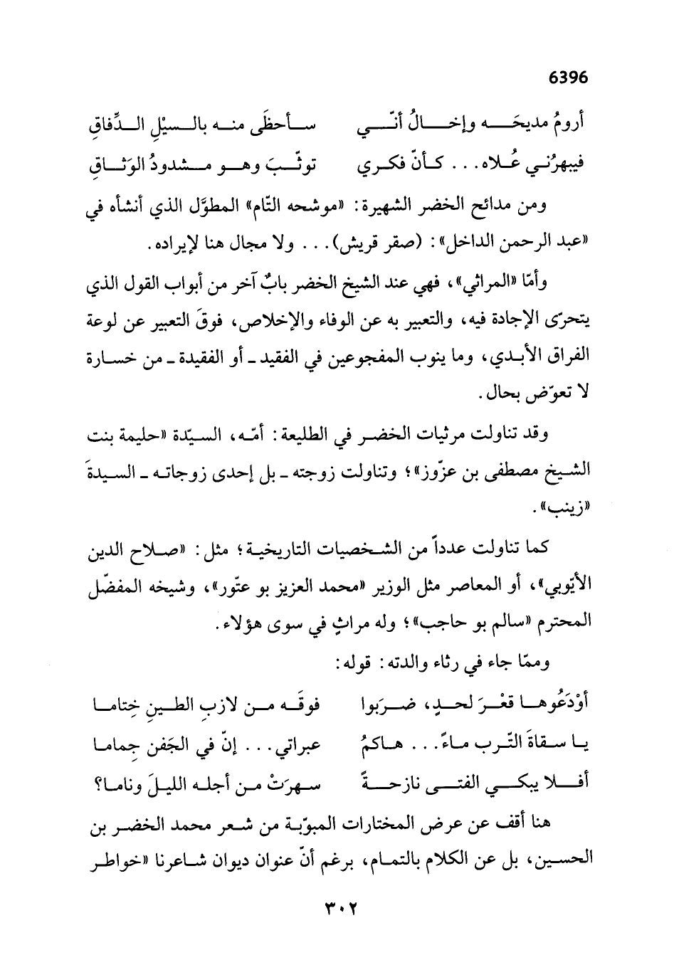 وأمّا "المراثي"، فهي عند الشيخ الخضر بابٌ آخر من أبواب القول الذي يتحرّى الإجادة فيه، والتعبير به عن الوفاء والإخلاص، فوقَ التعبير عن لوعة الفراق الأبدي، وما ينوب المفجوعين في الفقيد -أو الفقيدة- من خسارة لا تعوّض بحال.