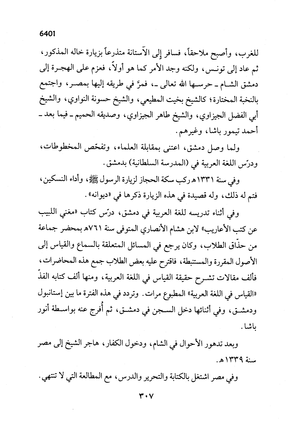 للغرب، وأصبح ملاحقاً، فسافر إلى الآستانة متذرعاً بزيارة خاله المذكور، ثم عاد إلى تونس، ولكنه وجد الأمر كما هو أولاً، فعزم على الهجرة إلى دمشق الشام -حرسها الله تعالى-، فمرَّ في طريقه إليها بمصر، واجتمع بالنخبة المختارة؛ كالشيخ بخيت المطيعي، والشيخ حسونة النواوي، والشيخ أبي الفضل الجيزاوي، والشيخ طاهر الجيزاوي، وصديقه الحميم -فيما بعد- أحمد تيمور باشا، وغيرهم.
