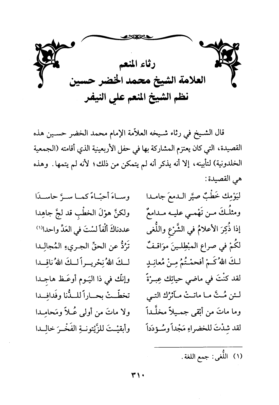 رثاء المنعم العلامة الشيخ محمد الخضر حسين نظم الشيخ المنعم على النيفر