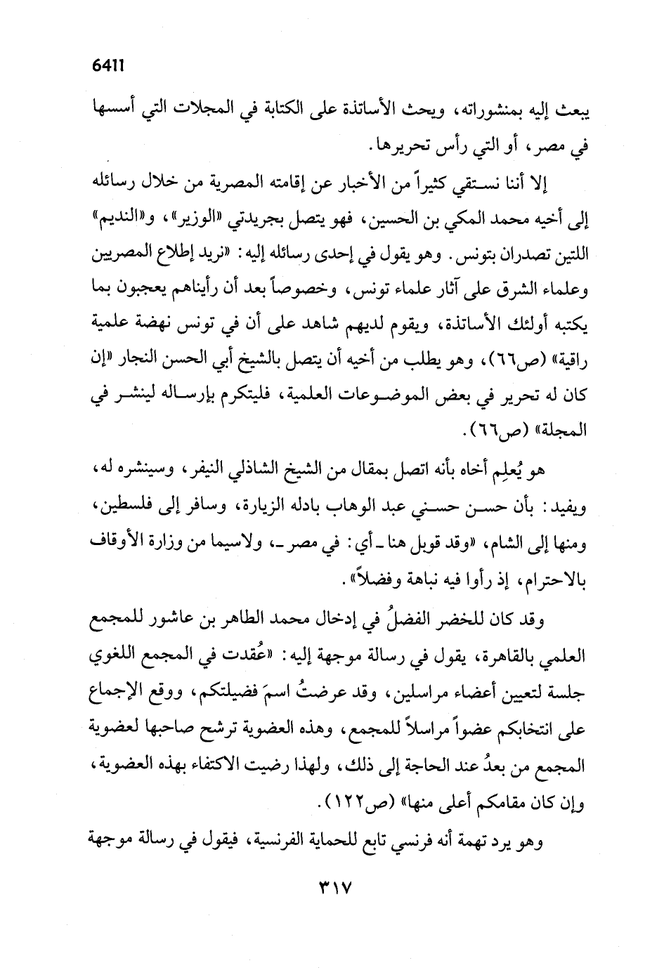 إلا أننا نستقي كثيراً من الأخبار عن إقامته المصرية من خلال رسائله إلى أخيه محمد المكي بن الحسين، فهو يتصل بجريدتي "الوزير"، و"النديم" اللتين تصدران بتونس. وهو يقول في إحدى رسائله إليه: "نريد إطلاع المصريين وعلماء الشرق على آثار علماء تونس، وخصوصاً بعد أن رأيناهم يعجبون بما يكتبه أولئك الأساتذة، ويقوم لديهم شاهد على أن في تونس نهضة علمية راقية" (ص 66)، وهو يطلب من أخيه أن يتصل بالشيخ أبي الحسن النجار "إن كان له تحرير في بعض الموضوعات العلمية، فليتكرم بإرساله لينشر في المجلة" (ص 66).