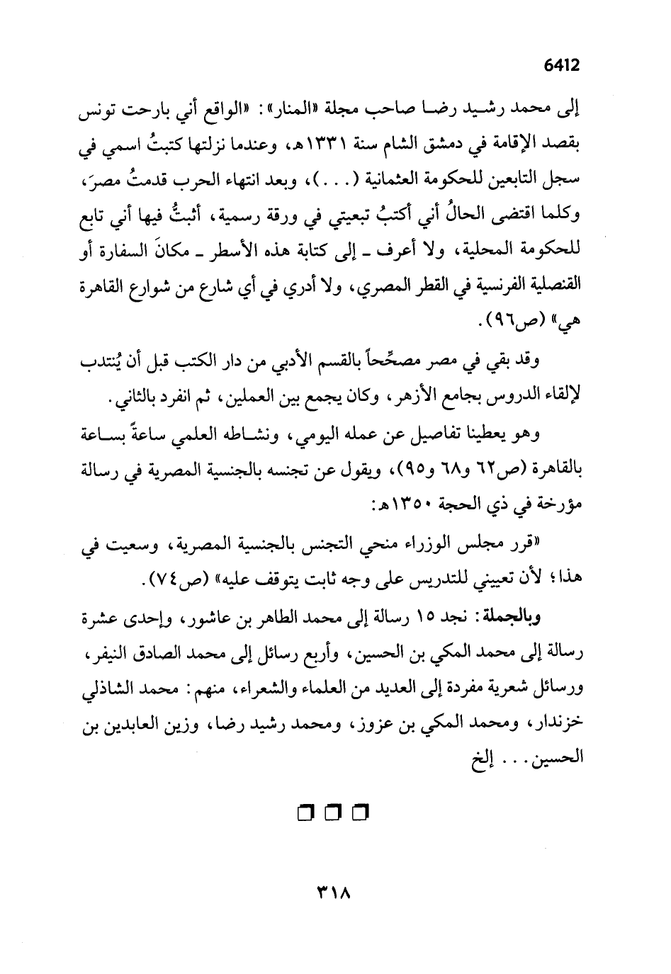 وهو يعطينا تفاصيل عن عمله اليومي، ونشاطه العلمي ساعةً بساعة بالقاهرة (ص 62 و 68 و 95)، ويقول عن تجنسه بالجنسية المصرية في رسالة مؤرخة في ذي الحجة 1350 هـ: