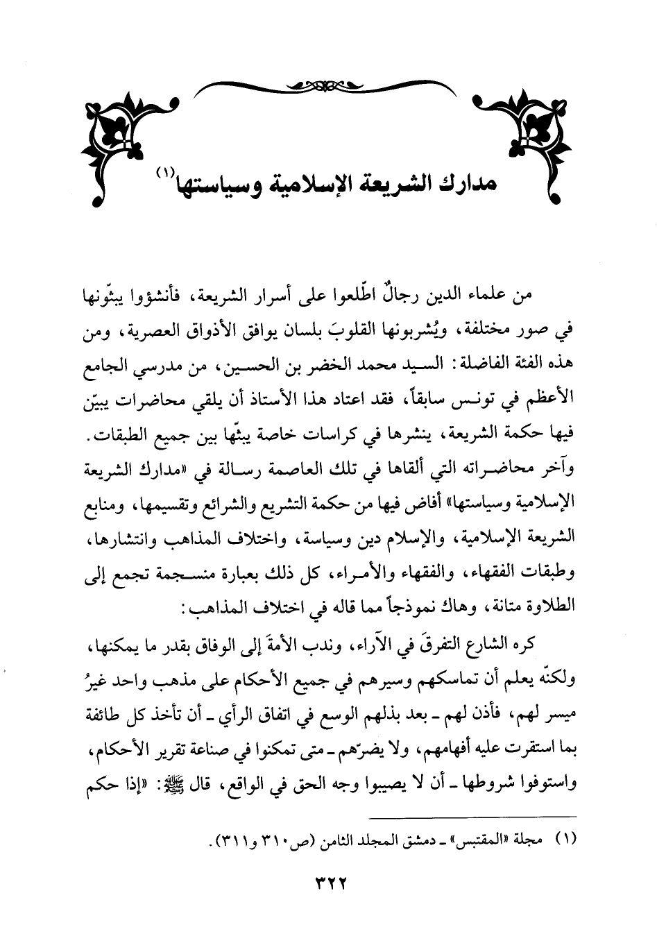من علماء الدين رجالٌ اطلعوا على أسرار الشريعة، فأنشؤوا يبثّونها في صور مختلفة، وُيشربونها القلوبَ بلسان يوافق الأذواق العصرية، ومن هذه الفئة الفاضلة: السيد محمد الخضر بن الحسين، من مدرسي الجامع الأعظم في تونس سابقاً، فقد اعتاد هذا الأستاذ أن يلقي محاضرات يبيّن فيها حكمة الشريعة، ينشرها في كراسات خاصة يبثّها بين جميع الطبقات. وآخر محاضراته التي ألقاها في تلك العاصمة رسالة في "مدارك الشريعة الإسلامية وسياستها" أفاض فيها من حكمة التشريع والشراع وتقسيمها، ومنابع الشريعة الإسلامية، والإسلام دين وسياسة، واختلاف المذاهب وانتشارها، وطبقات الفقهاء، والفقهاء والأمراء، كل ذلك بعبارة منسجمة تجمع إلى الطلاوة متانة، وهاك نموذجاً مما قاله في اختلاف المذاهب: