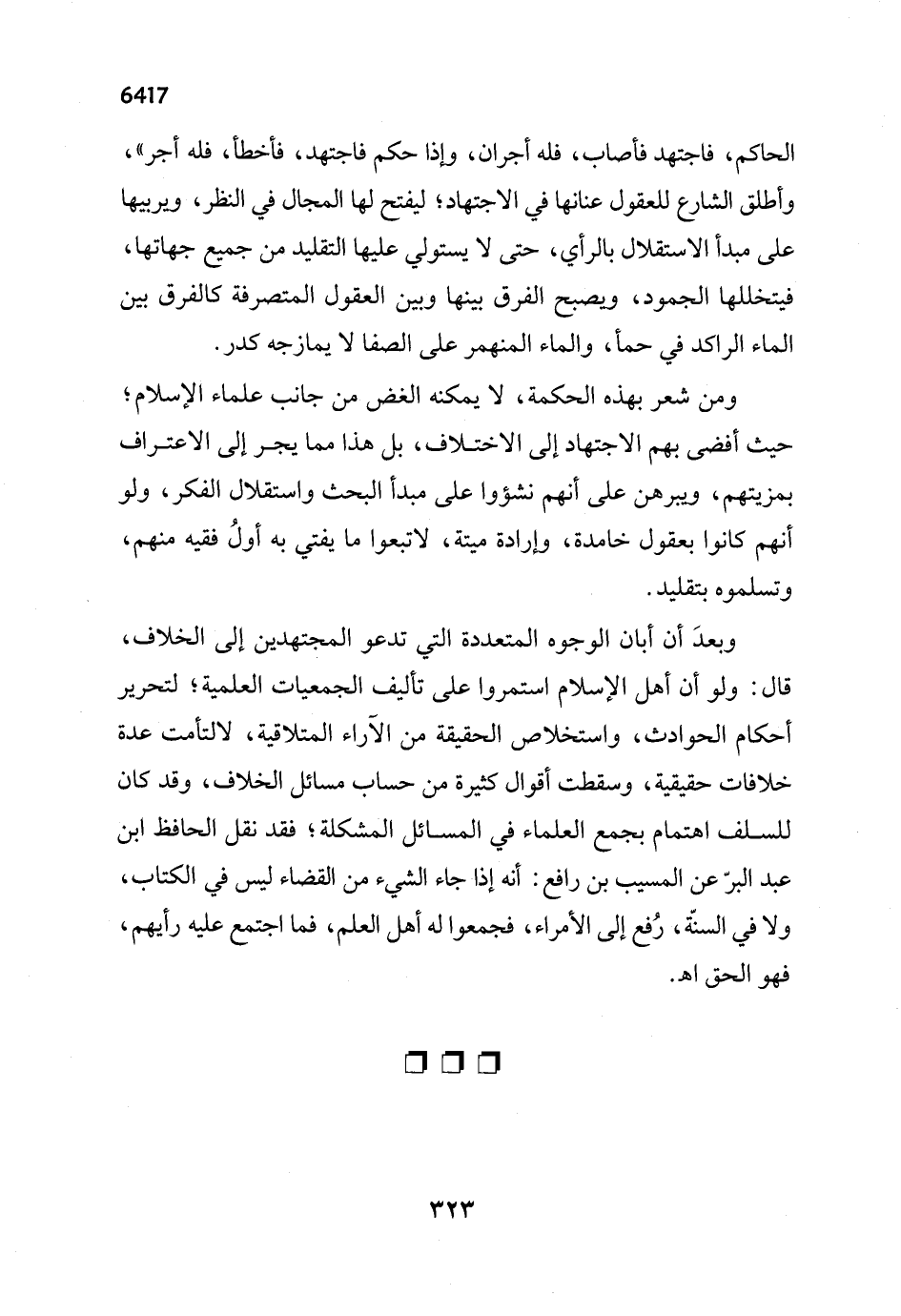 ومن شعر بهذه الحكمة، لا يمكنه الغض من جانب علماء الإسلام، حيث أفضى بهم الاجتهاد إلى الاختلاف، بل هذا مما يجر إلى الاعتراف بمزيتهم، ويبرهن على أنهم نشؤوا على مبدأ البحث واستقلال الفكر، ولو أنهم كانوا بعقول خامدة، وإرادة ميتة، لاتبعوا ما يفتي به أولُ فقيه منهم، وتسلموه بتقليد.