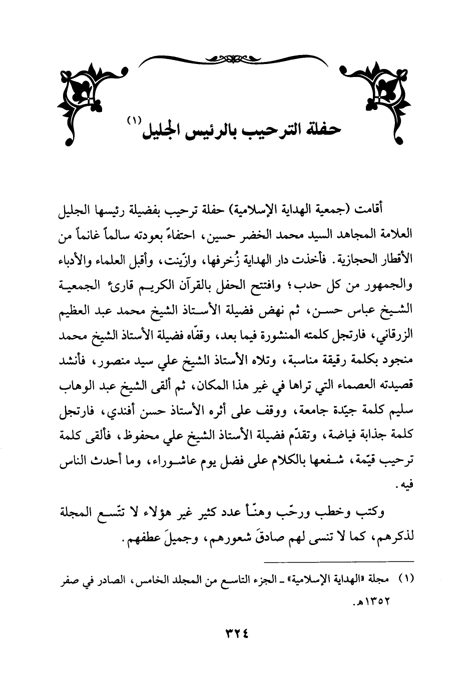 أقامت (جمعية الهداية الإسلامية) حفلة ترحيب بفضيلة رئيسها الجليل العلامة المجاهد السيد محمد الخضر حسين، احتفاءً بعودته سالما غانماً من الأقطار الحجازية. فأخذت دار الهداية زُخرفها، وازّينت، وأقبل العلماء والأدباء والجمهور من كل حدب؛ وافتتح الحفل بالقرآن الكريم قارئ الجمعية الشيخ عباس حسن، ثم نهض فضيلة الأستاذ الشيخ محمد عبد العظيم الزرقاني، فارتجل كلمته المنشورة فيما بعد، وقفّاه فضيلة الأستاذ الشيخ محمد منجود بكلمة رقيقة مناسبة، وتلاه الأستاذ الشيخ علي سيد منصور، فأنشد قصيدته العصماء التي تراها في غير هذا المكان، ثم ألقى الشيخ عبد الوهاب سليم كلمة جيّدة جامعة، ووقف على أثره الأستاذ حسن أفندي، فارتجل كلمة جذابة فياضة، وتقذم فضيلة الأستاذ الشيخ علي محفوظ، فألقى كلمة ترحيب قيّمة، شفعها بالكلام على فضل يوم عاشوراء، وما أحدث الناس فيه.