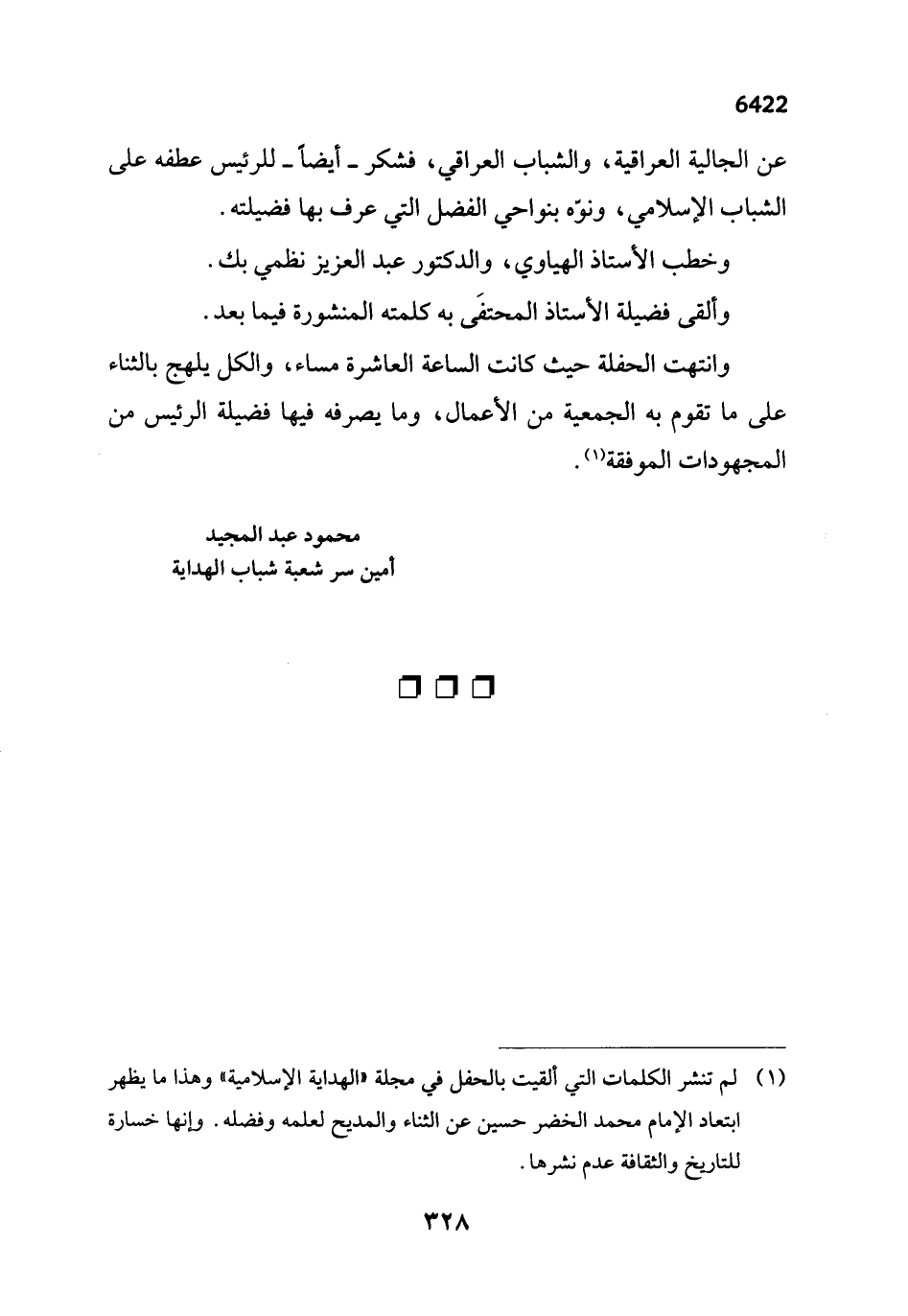 (¬1) لم تنشر الكلمات التي ألقيت بالحفل في مجلة "الهداية الإسلامية" وهذا ما يظهر ابتعاد الإمام محمد الخضر حسين عن الثناء والمديح لعلمه وفضله. وإنها خسارة للتاريخ والثقافة عدم نشرها.