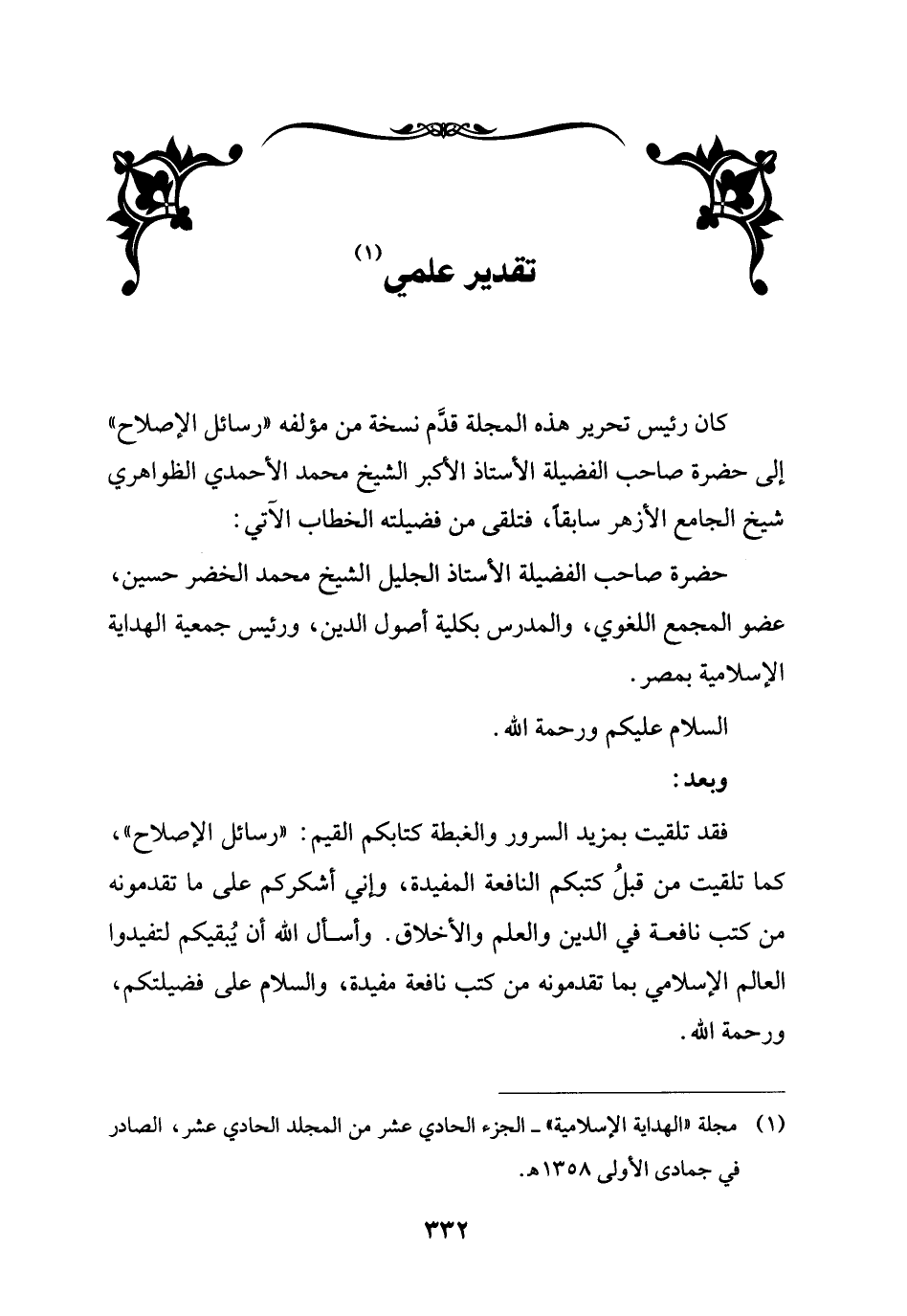حضرة صاحب الفضيلة الأستاذ الجليل الشيخ محمد الخضر حسين، عضو المجمع اللغوي، والمدرس بكلية أصول الدين، ورئيس جمعية الهداية الإسلامية بمصر.