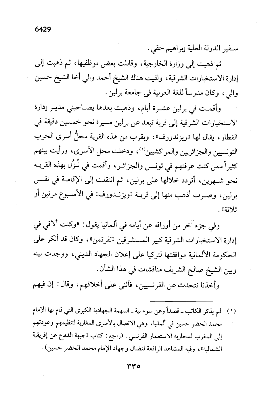 (¬1) لم يذكر الكاتب -قصداً وعن سوء نية- المهمة الجهادية الكبرى التي قام بها الإمام محمد الخضر حسين في ألمانيا، وهي الاتصال بالأسرى المغاربة لتنظيمهم وعودتهم إلى المغرب لمحاربة الاستعمار الفرنسي. (راجع: كتاب "جبهة الدفاع عن إفريقية الشمالية"، وفيه المشاهد الرافعة لنضال وجهاد الإمام محمد الخضر حسين).
