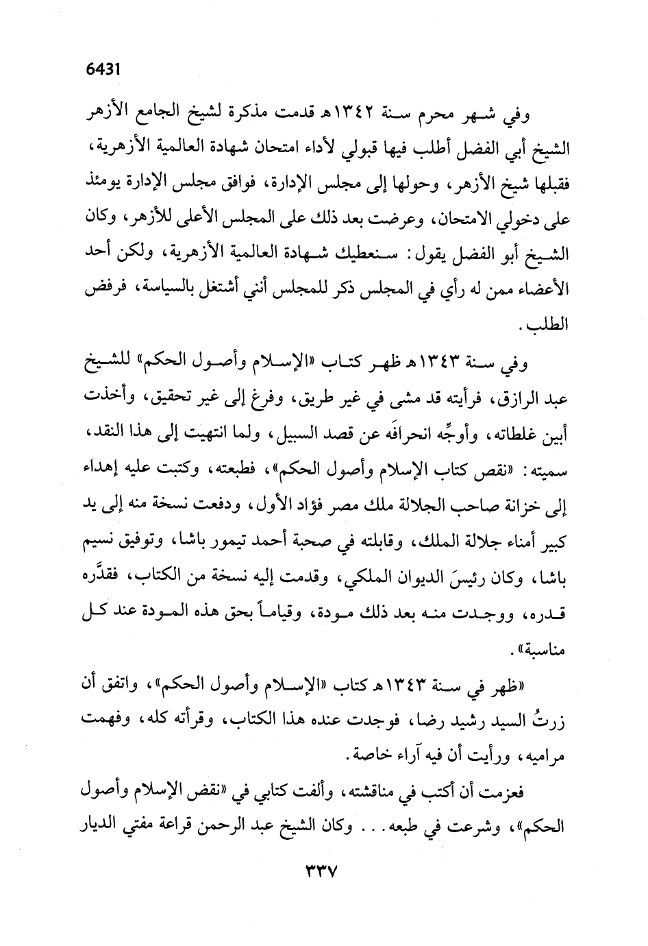 "ظهر في سنة 1343 هـ كتاب "الإسلام وأصول الحكم"، واتفق أن زرتُ السيد رشيد رضا، فوجدت عنده هذا الكتاب، وقرأته كله، وفهمت مراميه، ورأيت أن فيه آراء خاصة.