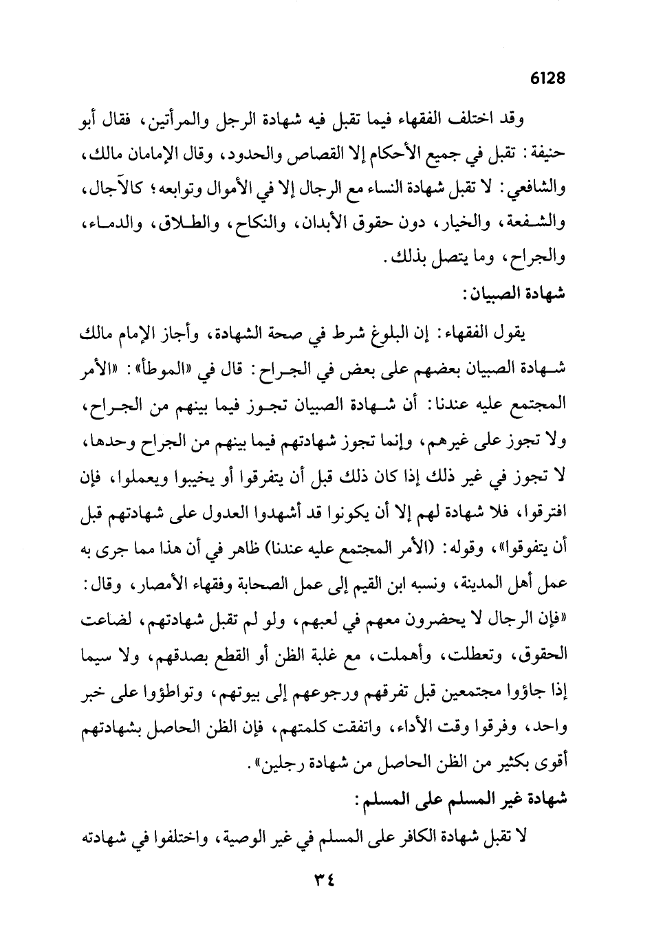 يقول الفقهاء: إن البلوغ شرط في صحة الشهادة، وأجاز الإمام مالك شهادة الصبيان بعضهم على بعض في الجراح: قال في "الموطأ": "الأمر المجتمع عليه عندنا: أن شهادة الصبيان تجوز فيما بينهم من الجراح، ولا تجوز على غيرهم، وإنما تجوز شهادتهم فيما بينهم من الجراح وحدها، لا تجوز في غير ذلك إذا كان ذلك قبل أن يتفرقوا أو يخيبوا ويعملوا، فإن افترقوا، فلا شهادة لهم إِلا أن يكونوا قد أشهدوا العدول على شهادتهم قبل أن يتفوقوا"، وقوله: (الأمر المجتمع عليه عندنا) ظاهر في أن هذا مما جرى به عمل أهل المدينة، ونسبه ابن القيم إلى عمل الصحابة وفقهاء الأمصار، وقال: "فإن الرجال لا يحضرون معهم في لعبهم، ولو لم تقبل شهادتهم، لضاعت الحقوق، وتعطلت، وأهملت، مع غلبة الظن أو القطع بصدقهم، ولا سيما إذا جاؤوا مجتمعين قبل تفرقهم ورجوعهم إلى بيوتهم، وتواطؤوا على خبر واحد، وفرقوا وقت الأداء، واتفقت كلمتهم، فإن الظن الحاصل بشهادتهم أقوى بكثير من الظن الحاصل من شهادة رجلين".