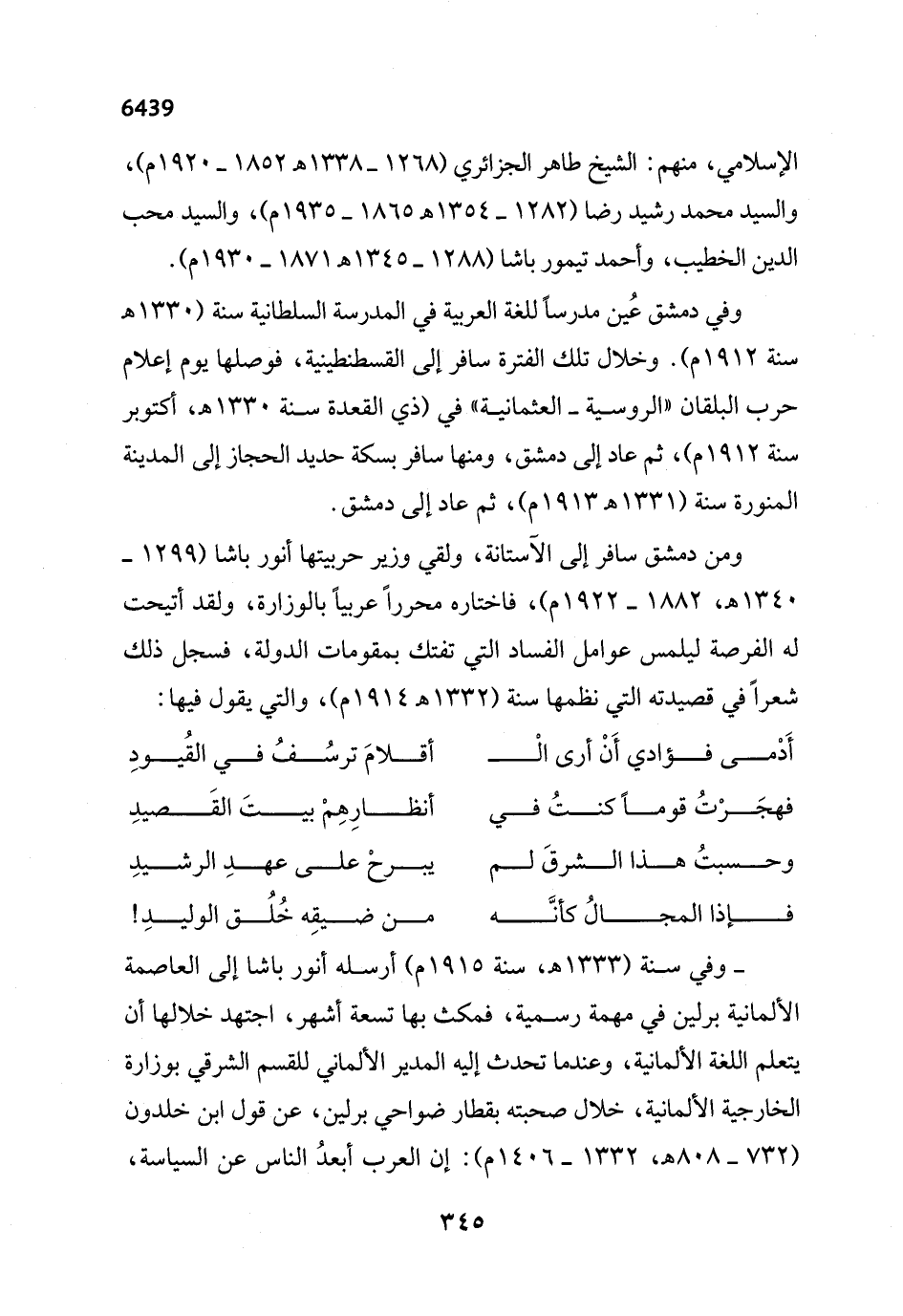 - وفي سنة (1333 هـ، سنة 1915 م) أرسله أنور باشا إلى العاصمة الألمانية برلين في مهمة رسمية، فمكث بها تسعة أشهر، اجتهد خلالها أن يتعلم اللغة الألمانية، وعندما تحدث إليه المدير الألماني للقسم الشرقي بوزارة الخارجية الألمانية، خلال صحبته بقطار ضواحي برلين، عن قول ابن خلدون (732 - 808 هـ، 1332 - 1406 م): إن العرب أبعدُ الناس عن السياسة،