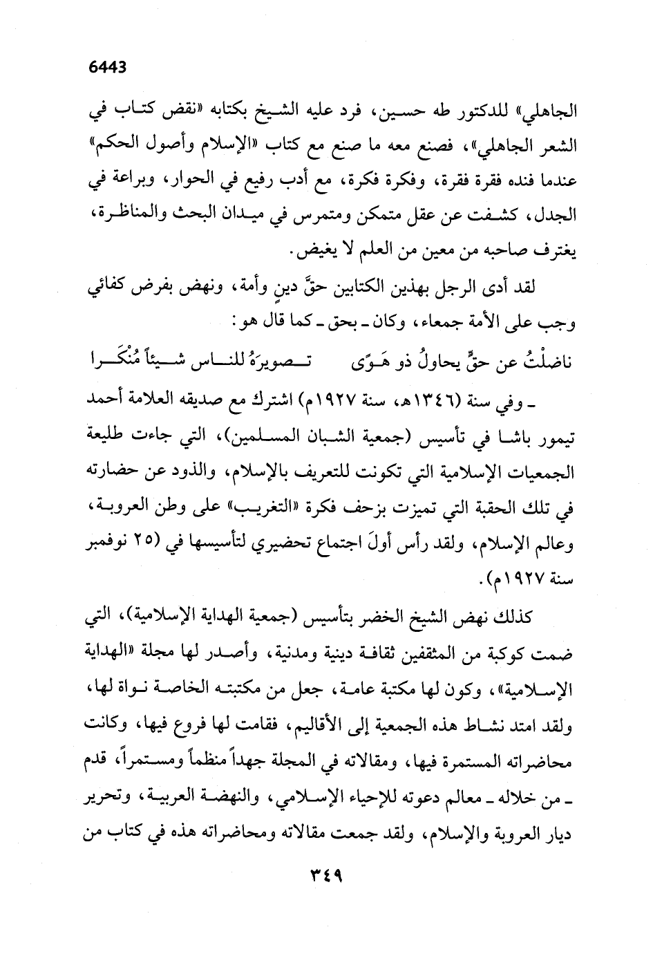 كذلك نهض الشيخ الخضر بتأسيس (جمعية الهداية الإسلامية)، التي ضمت كوكبة من المثقفين ثقافة دينية ومدنية، وأصدر لها مجلة "الهداية الإسلامية"، وكون لها مكتبة عامة، جعل من مكتبته الخاصة نواة لها، ولقد امتد نشاط هذه الجمعية إلى الأقاليم، فقامت لها فروع فيها، وكانت محاضراته المستمرة فيها، ومقالاته في المجلة جهداً منظماً ومستمراً، قدم -من خلاله- معالم دعوته للإحياء الإسلامي، والنهضة العربية، وتحرير ديار العروبة والإسلام، ولقد جمعت مقالاته ومحاضراته هذه في كتاب من