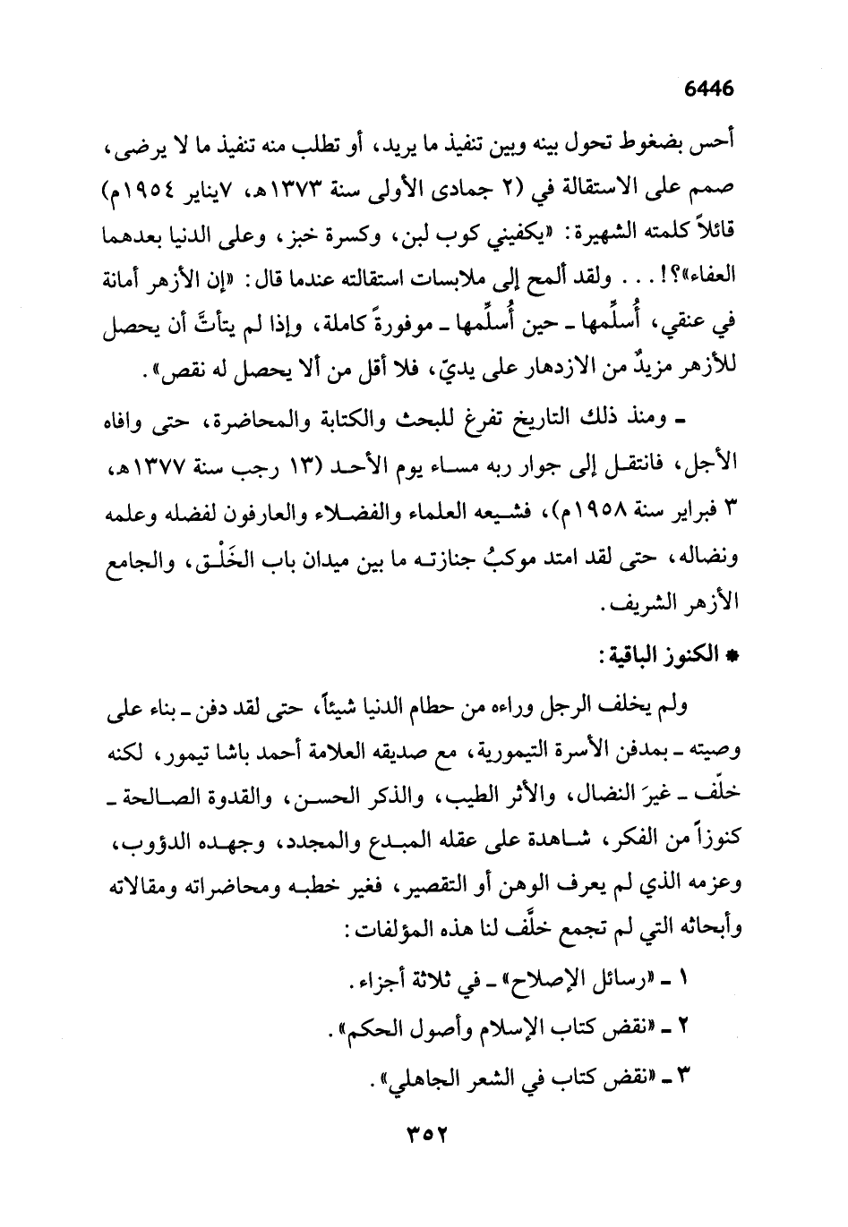 - ومنذ ذلك التاريخ تفرغ للبحث والكتابة والمحاضرة، حتى وافاه الأجل، فانتقل إلى جوار ربه مساء يوم الأحد (13 رجب سنة 1377 هـ، 3 فبراير سنة 1958 م)، فشيعه العلماء والفضلاء والعارفون لفضله وعلمه ونضاله، حتى لقد امتد موكبُ جنازته ما بين ميدان باب الخَلْق، والجامع الأزهر الشريف.