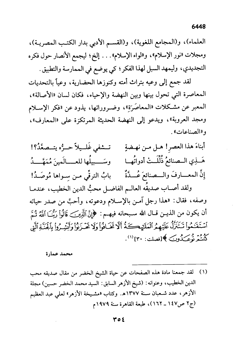 (¬1) لقد جمعنا مادة هذه الصفحات عن حياة الشيخ الخضر من مقال صديقه محب الدين الخطيب، وعنوانه: (شيخ الأزهر السابق: السيد محمد الخضر حسين) مجلة الأزهر، عدد شعبان سنة 1377 هـ. وكتاب "مشيخة الأزهر" لعلي عبد العظيم (ج 2 ص 147 - 162)، طبعة القاهرة سنة 1979 م
