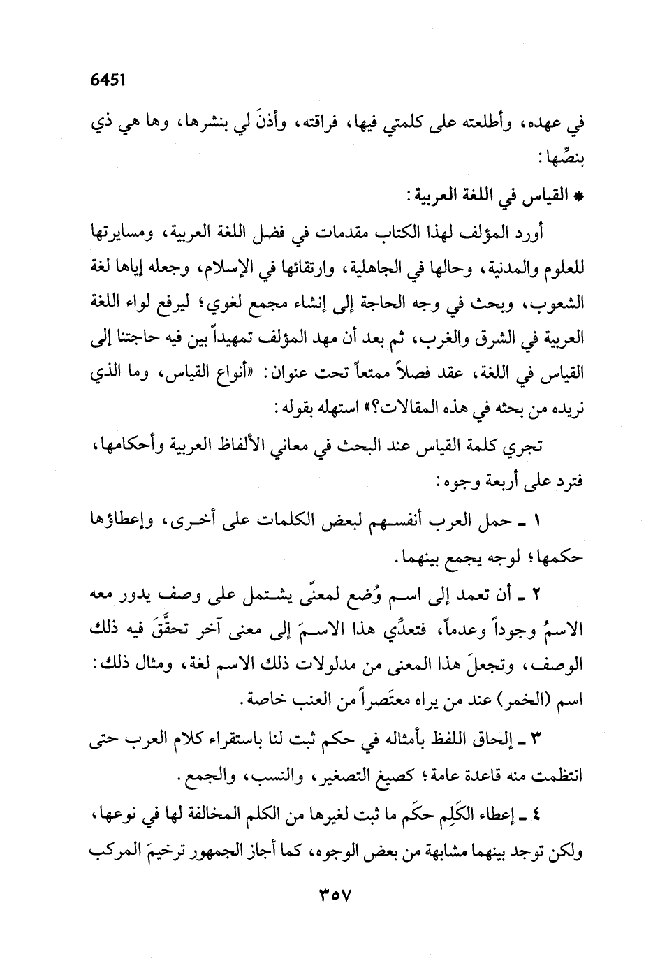 أورد المؤلف لهذا الكتاب مقدمات في فضل اللغة العربية، ومسايرتها للعلوم والمدنية، وحالها في الجاهلية، وارتقائها في الإسلام، وجعله إياها لغة الشعوب، وبحث في وجه الحاجة إلى إنشاء مجمع لغوي؛ ليرفع لواء اللغة العربية في الشرق والغرب، ثم بعد أن مهد المؤلف تمهيداً بين فيه حاجتنا إلى القياس في اللغة، عقد فصلاً ممتعاً تحت عنوان: "أنواع القياس، وما الذي نريده من بحثه في هذه المقالات؟ " استهله بقوله: