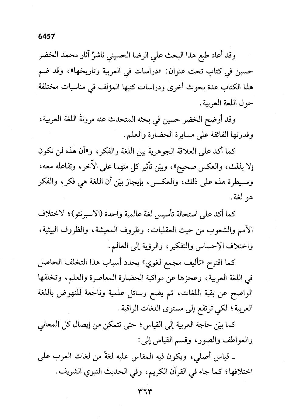 وقد أوضح الخضر حسين في بحثه المتحدث عنه مرونةَ اللغة العربية، وقدرتها الفائقة على مسايرة الحضارة والعلم.