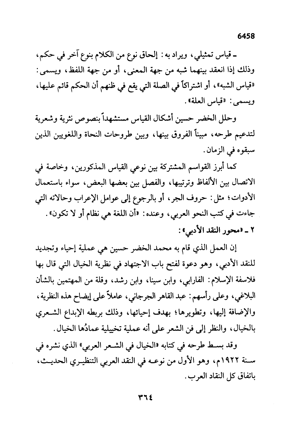 وحلل الخضر حسين أشكال القياس مستشهداً بنصوص نثرية وشعرية لتدعيم طرحه، مبيناً الفروق بينها، وبين طروحات النحاة واللغويين الذين سبقوه في الزمان.
