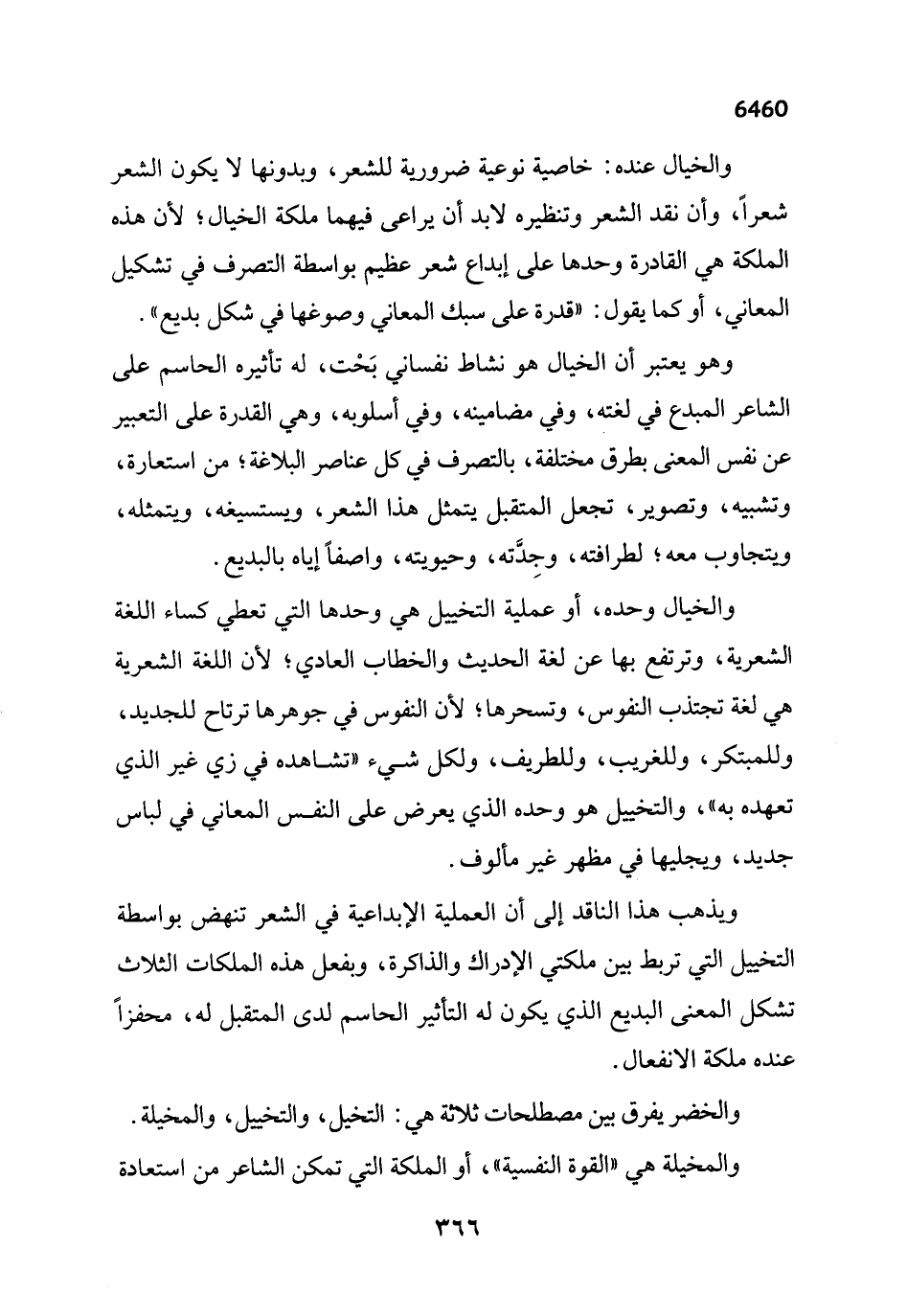 وهو يعتبر أن الخيال هو نشاط نفساني بَحْت، له تأثيره الحاسم على الشاعر المبدع في لغته، وفي مضامينه، وفي أسلوبه، وهي القدرة على التعبير عن نفس المعنى بطرق مختلفة، بالتصرف في كل عناصر البلاغة؛ من استعارة، وتشبيه، وتصوير، تجعل المتقبل يتمثل هذا الشعر، ويستسيغه، ويتمثله، ويتجاوب معه؛ لطرافته، وجِدَّته، وحيويته، واصفاً إياه بالبديع.