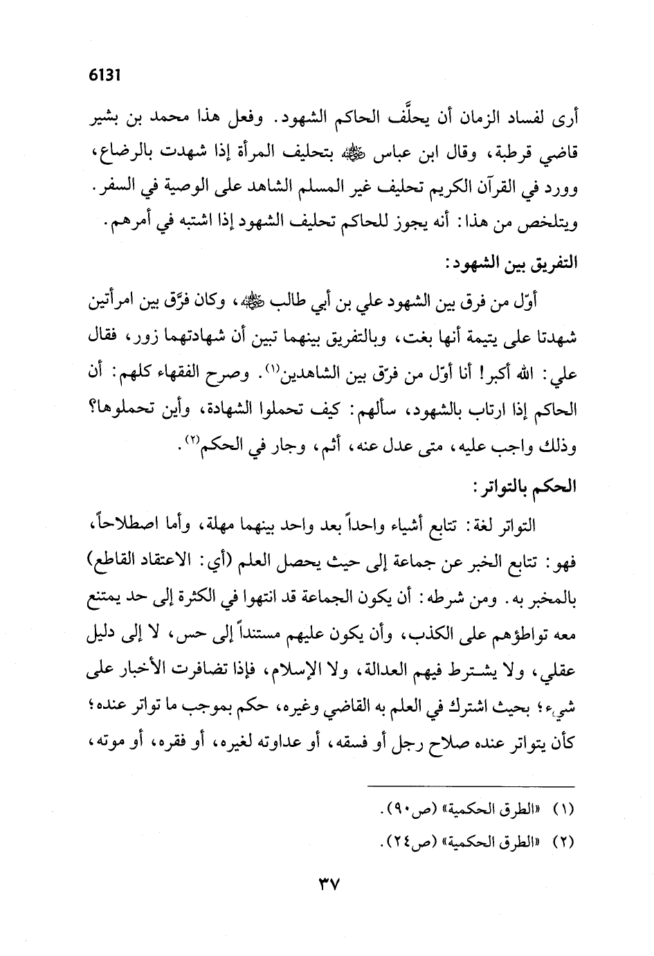 أرى لفساد الزمان أن يحلَّف الحاكم الشهود. وفعل هذا محمد بن بشير قاضي قرطبة، وقال ابن عباس - رضي الله عنه - بتحليف المرأة إذا شهدت بالرضاع، وورد في القرآن الكريم تحليف غير المسلم الشاهد على الوصية في السفر. ويتلخص من هذا: أنه يجوز للحاكم تحليف الشهود إذا اشتبه في أمرهم.
