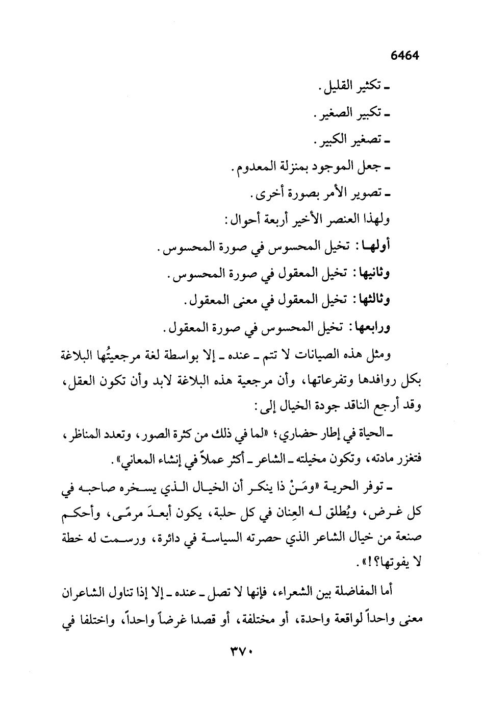 ومثل هذه الصيانات لا تتم -عنده- إلا بواسطة لغة مرجعيتُها البلاغة بكل روافدها وتفرعاتها، وأن مرجعية هذه البلاغة لابد وأن تكون العقل، وقد أرجع الناقد جودة الخيال إلى: