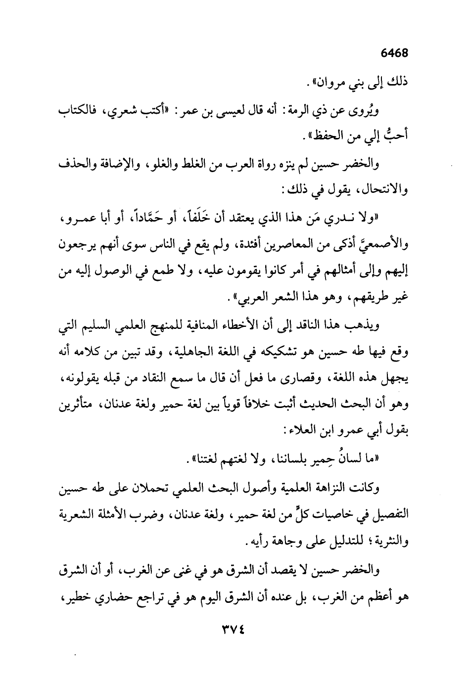 "ولا ندري مَن هذا الذي يعتقد أن خَلَفاً، أو حَمَّاداً، أو أبا عمرو، والأصمعيَّ أذكى من المعاصرين أفئدة، ولم يقع في الناس سوى أنهم يرجعون إليهم وإلى أمثالهم في أمر كانوا يقومون عليه، ولا طمع في الوصول إليه من غير طريقهم، وهو هذا الشعر العربي".