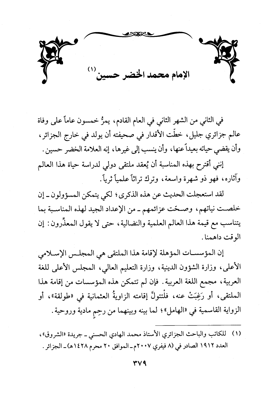 في الثاني من الشهر الثاني في العام القادم، يمرُّ خمسون عاماً على وفاة عالم جزائري جليل، خطّت الأقدار في صحيفته أن يولد في خارج الجزائر، وأن يقضي حياته بعيداً عنها، وأن ينسب إلى غيرها، إنه العلامة الخضر حسين.