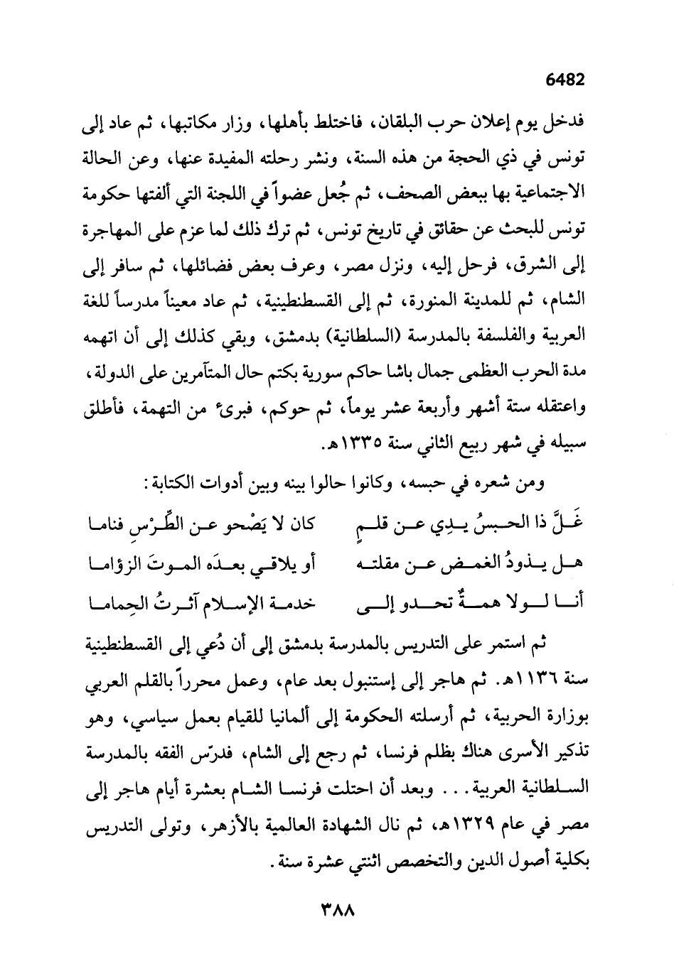 فدخل يوم إعلان حرب البلقان، فاختلط بأهلها، وزار مكاتبها، ثم عاد إلى تونس في ذي الحجة من هذه السنة، ونشر رحلته المفيدة عنها، وعن الحالة الاجتماعية بها ببعض الصحف، ثم جُعل عضواً في اللجنة التي ألفتها حكومة تونس للبحث عن حقائق في تاريخ تونس، ثم ترك ذلك لما عزم على المهاجرة إلى الشرق، فرحل إليه، ونزل مصر، وعرف بعض فضائلها، ثم سافر إلى الشام، ثم للمدينة المنورة، ثم إلى القسطنطينية، ثم عاد معيناً مدرساً للغة العربية والفلسفة بالمدرسة (السلطانية) بدمشق، وبقي كذلك إلى أن اتهمه مدة الحرب العظمى جمال باشا حكم سورية بكتم حال المتآمرين على الدولة، واعتقله ستة أشهر وأربعة عشر يوماً، ثم حوكم، فبرئ من التهمة، فأطلق سبيله في شهر ربيع الثاني سنة 1335 هـ.