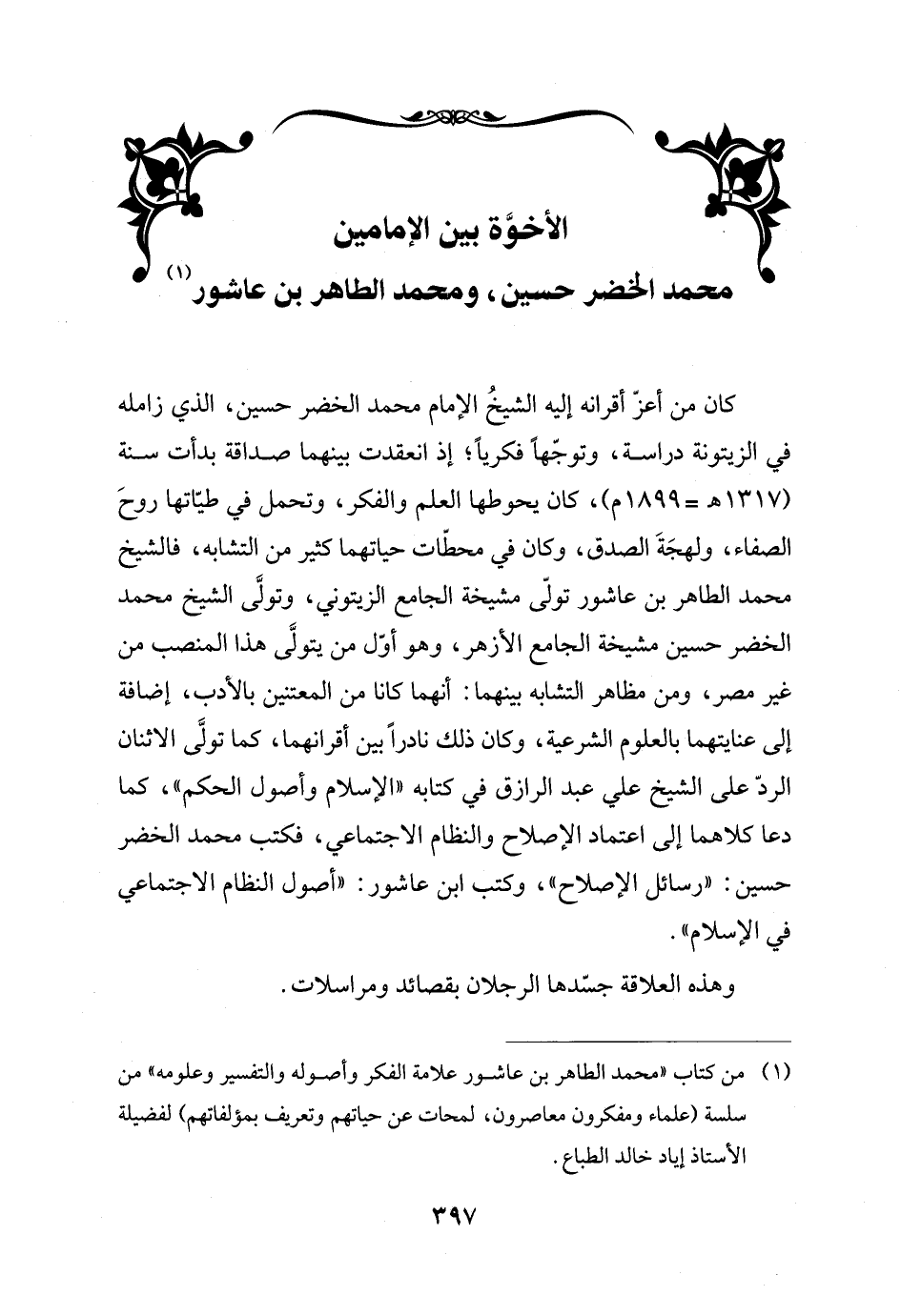 الأخوَّة بين الإمامين محمد الخضر حسين , ومحمد الطاهر بن عاشور (¬1)
