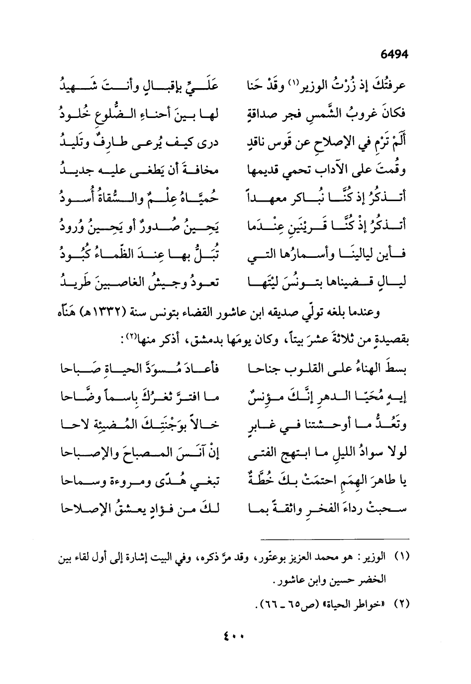 (¬1) الوزير: هو محمد العزيز بوعتّور، وقد من ذكره، وفي البيت اشارة إلى أول لقاء بين الخضر حسين وابن عاشور.