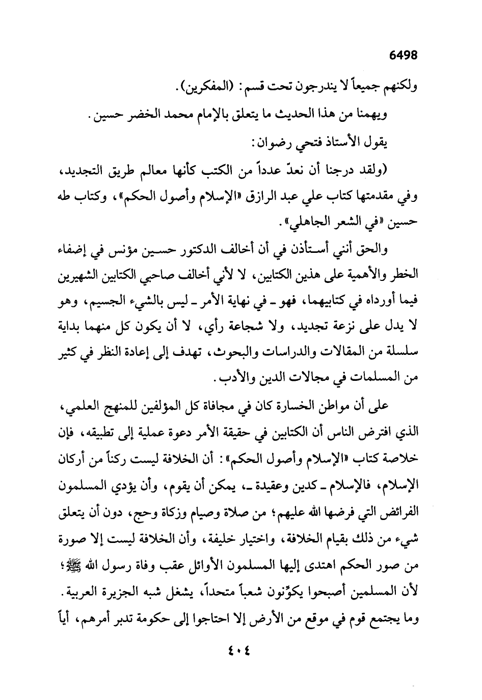 (ولقد درجنا أن نعدّ عدداً من الكتب كأنها معالم طريق التجديد، وفي مقدمتها كتاب علي عبد الرازق "الإسلام وأصول الحكم"، وكتاب طه حسين "في الشعر الجاهلي".