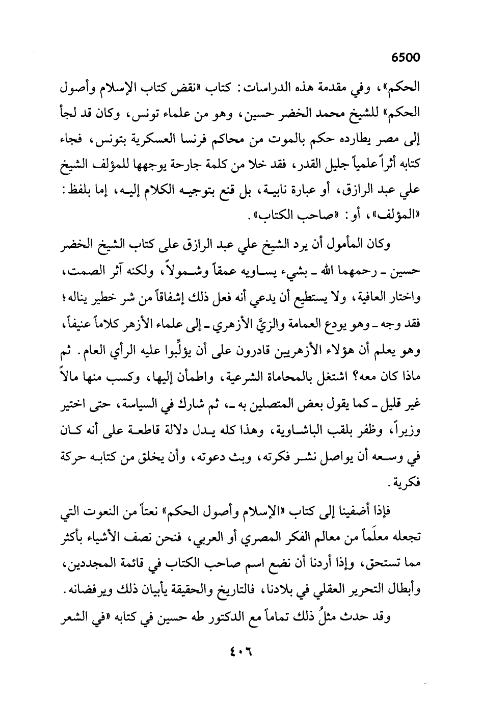 الحكم "، وفي مقدمة هذه الدراسات: كتاب "نقض كتاب الإسلام وأصول الحكم " للشيخ محمد الخضر حسين، وهو من علماء تونس، وكان قد لجأ إلى مصر يطارده حكم بالموت من محاكم فرنسا العسكرية بتونس، فجاء كتابه أثراً علمياً جليل القدر، فقد خلا من كلمة جارحة يوجهها للمؤلف الشيخ علي عبد الرازق، أو عبارة نابية، بل قنع بتوجيه الكلام إليه، إما بلفظ: "المؤلف"، أو: "صاحب الكتاب".