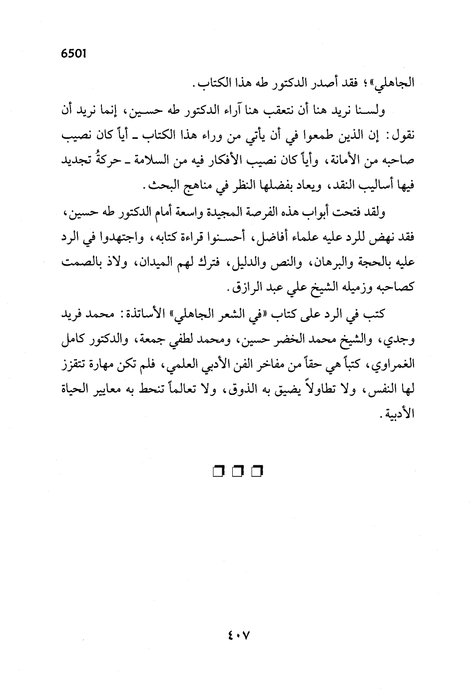 ولسنا نريد هنا أن نتعقب هنا آراء الدكتور طه حسين، إنما نريد أن نقول: إن الذين طمعوا في أن يأتي من وراء هذا الكتاب -أياً كان نصيب صاحبه من الأمانة، وأياً كان نصيب الأفكار فيه من السلامة- حركةُ تجديد فيها أساليب النقد، ويعاد بفضلها النظر في مناهج البحث.