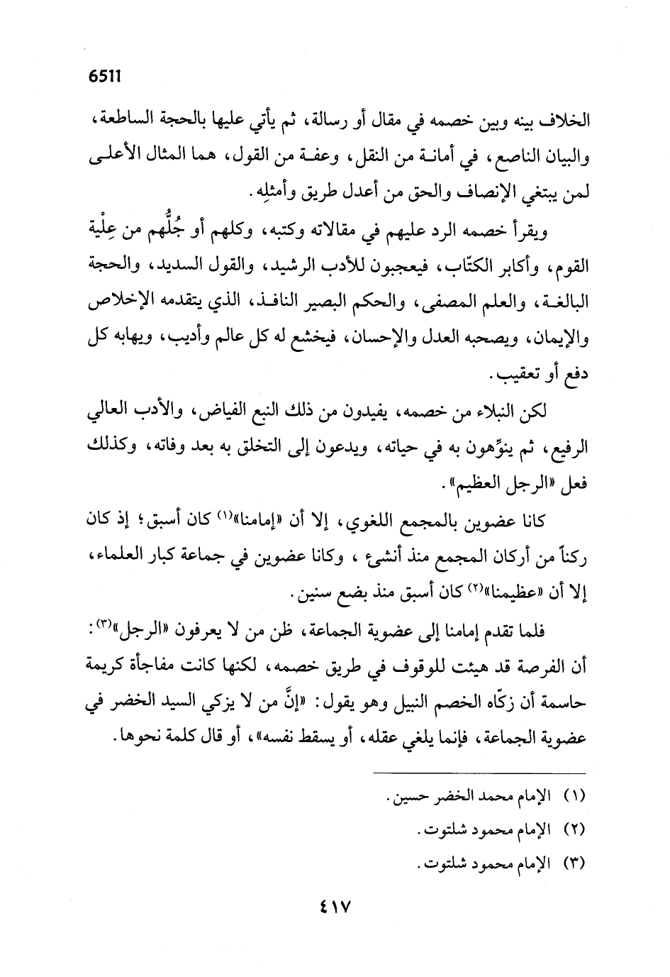 ويقرأ خصمه الرد عليهم في مقالاته وكتبه، وكلهم أو جُلُّهم من عِلْية القوم، وأكابر الكتّاب، فيعجبون للأدب الرشيد، والقول السديد، والحجة البالغة، والعلم المصفى، والحكم البصير النافذ، الذي يتقدمه الإخلاص والإيمان، ويصحبه العدل والإحسان، فيخشع له كل عالم وأديب، ويهابه كل دفع أو تعقيب.