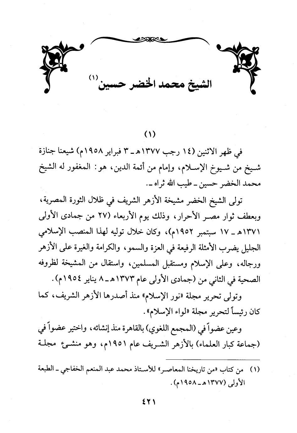 في ظهر الاثنين (14 رجب 1377 هـ - 3 فبراير 1958 م) شيعنا جنازة شيخ من شيوخ الإسلام، وإمام من أئمة الدين، هو: المغفور له الشيخ محمد الخضر حسين -طيب الله ثراه-.