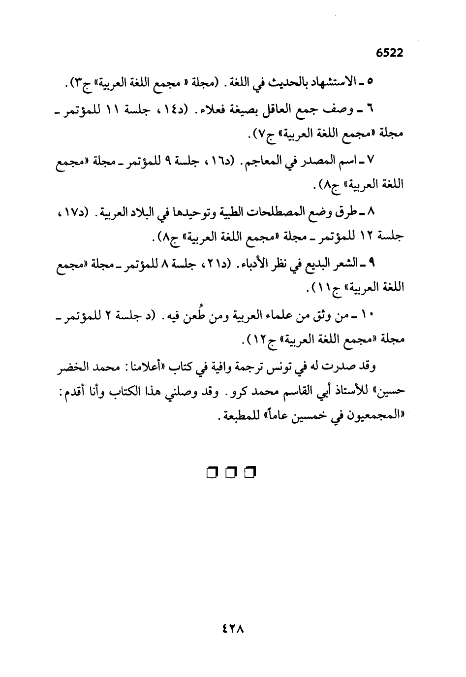 وقد صدرت له في تونس ترجمة وافية في كتاب "أعلامنا: محمد الخضر حسين" للأستاذ أبي القاسم محمد كرو. وقد وصلني هذا الكتاب وأنا أقدم: "المجمعيون في خمسين عاماً" للمطبعة.
