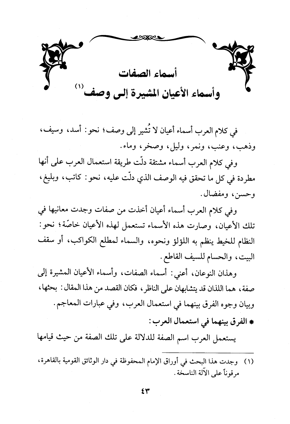وهذان النوعان، أعني: أسماء الصفات، وأسماء الأعيان المشيرة إلى صفة، هما اللذان قد يتشابهان على الناظر، فكان القصد من هذا المقال: بحثها، وبيان وجوه الفرق بينهما في استعمال العرب، وفي عبارات المعاجم.