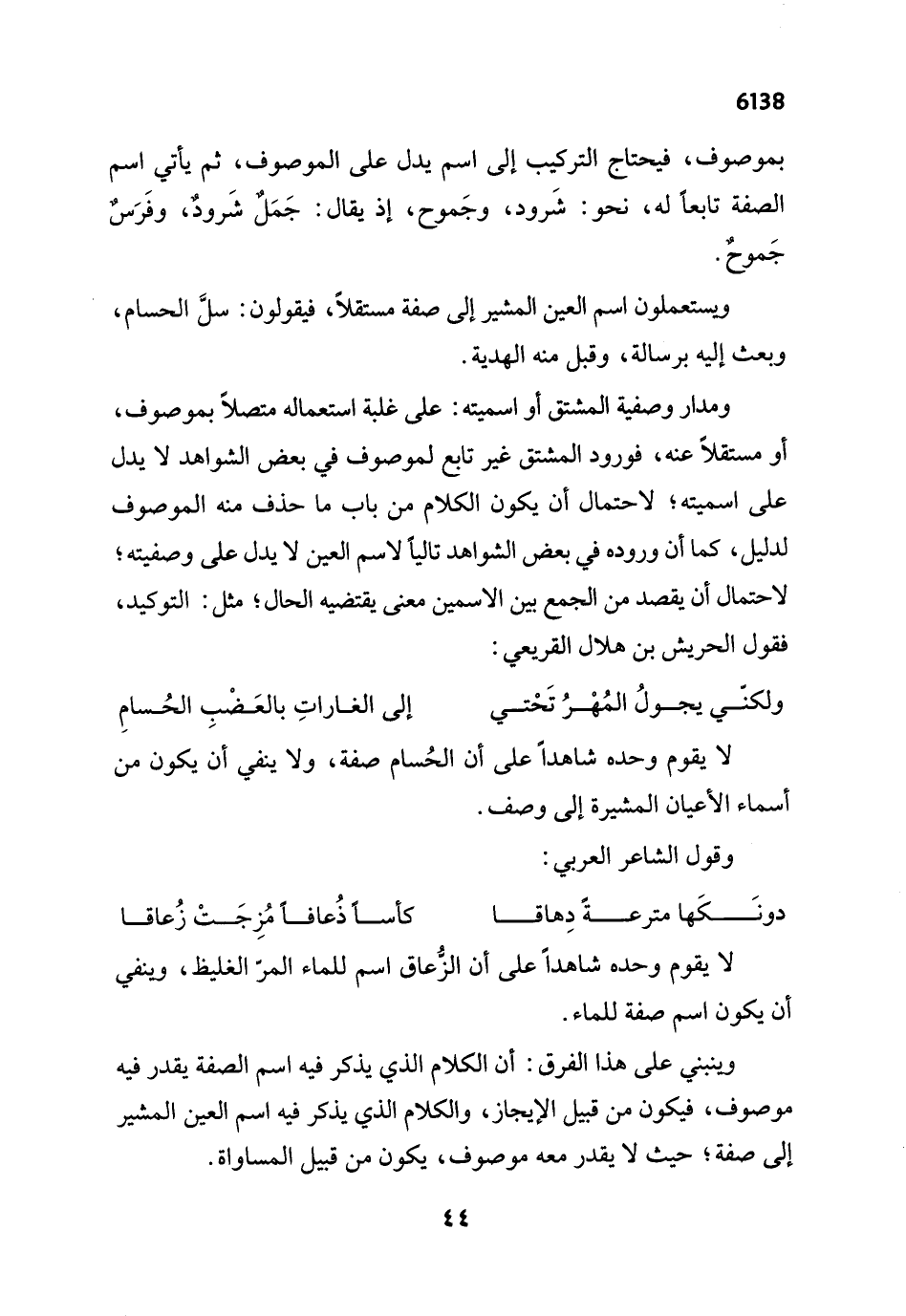 ومدار وصفية المشتق أو اسميته: على غلبة استعماله متصلاً بموصوف، أو مستقلاً عنه، فورود المشتق غير تابع لموصوف في بعض الشواهد لا يدل على اسميته؛ لاحتمال أن يكون الكلام من باب ما حذف منه الموصوف لدليل، كما أن وروده في بعض الشواهد تالياً لاسم العين لا يدل على وصفيته؛ لاحتمال أن يقصد من الجمع بين الاسمين معنى يقتضيه الحال؛ مثل: التوكيد، فقول الحريش بن هلال القريعي: