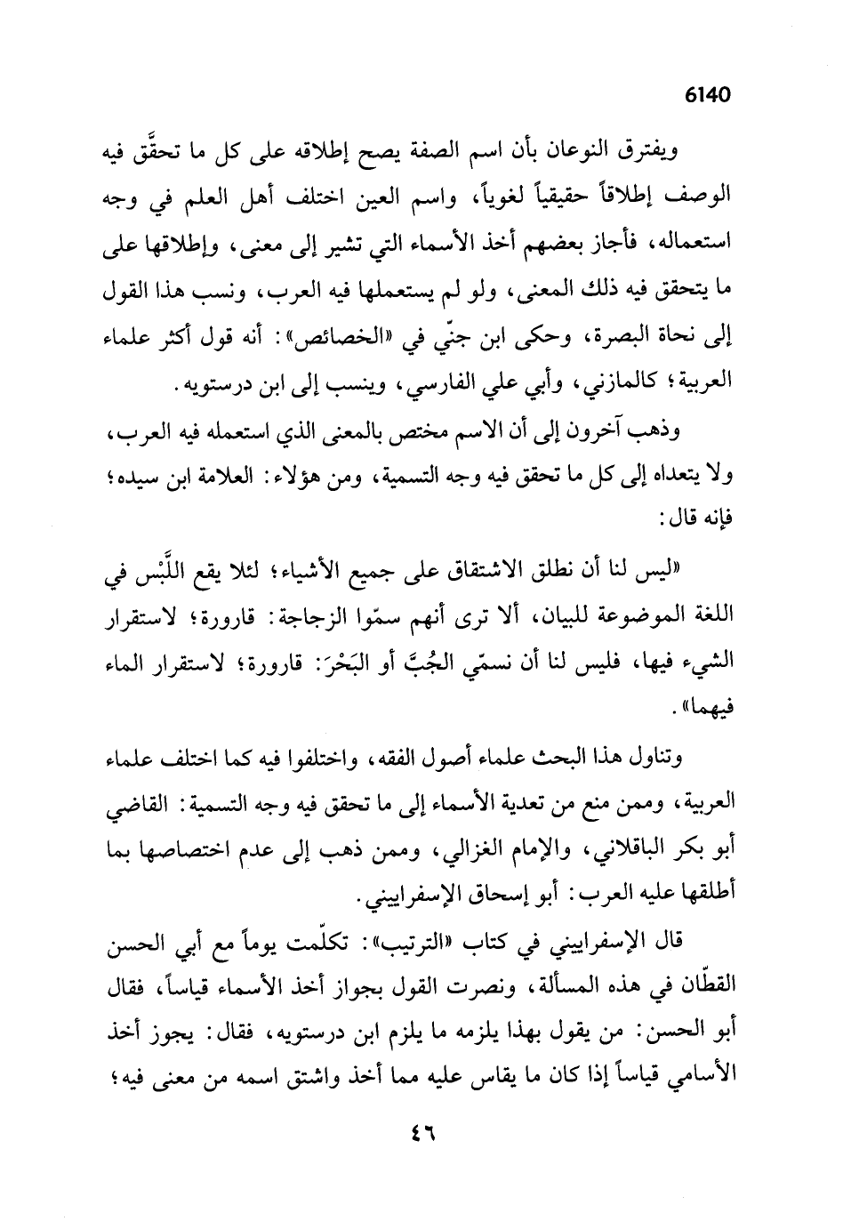 "ليس لنا أن نطلق الاشتقاق على جميع الأشياء؛ لئلا يقع اللَّبْس في اللغة الموضوعة للبيان، ألا ترى انهم سمّوا الزجاجة: قارورة؛ لاستقرار الشيء فيها، فليس لنا أن نسمّي الجُبَّ أو البَحْرَ: قارورة؛ لاستقرار الماء فيهما".